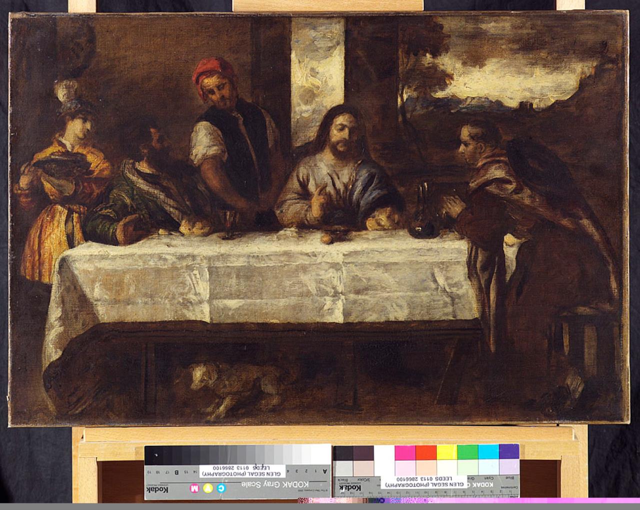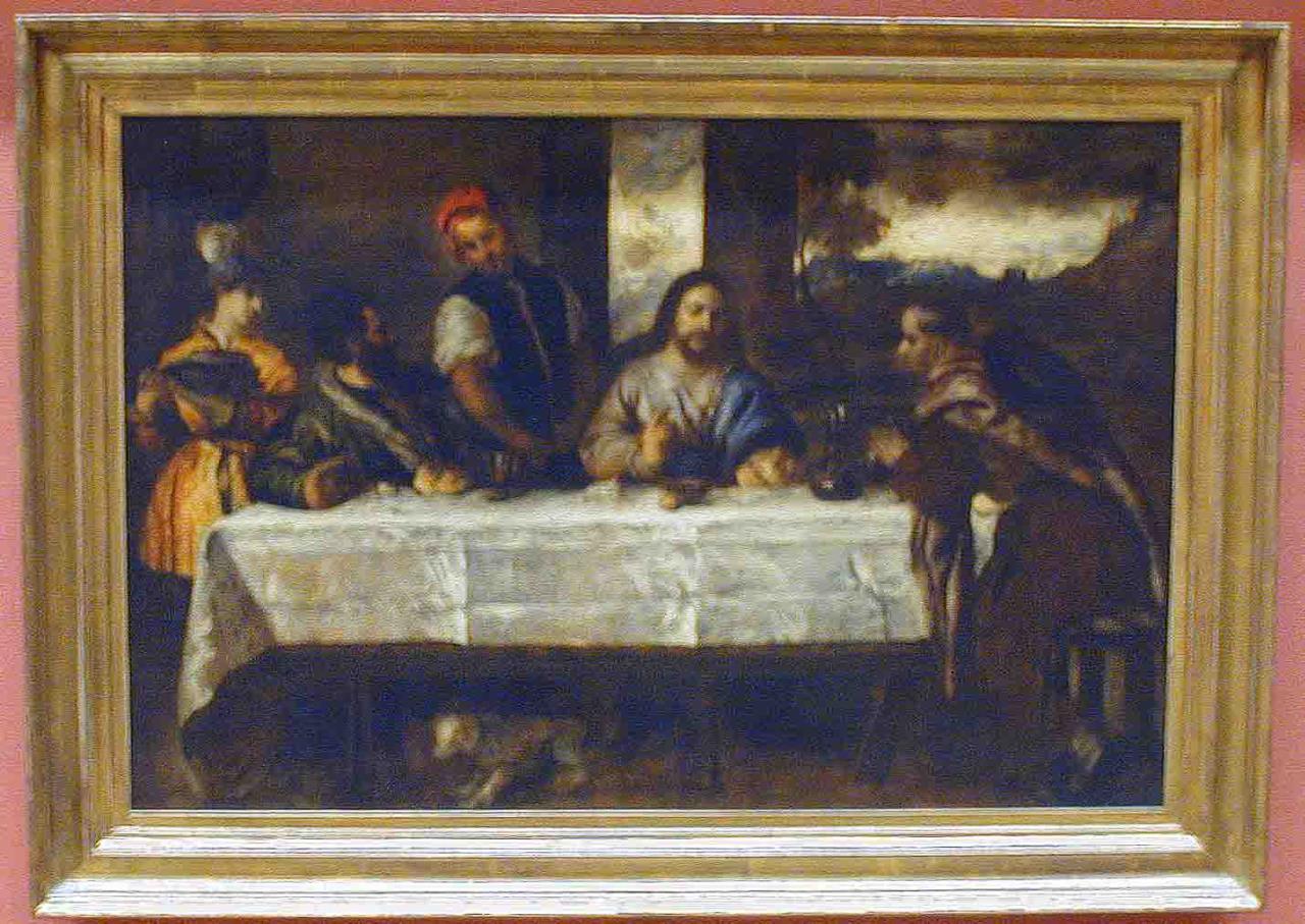 - Christ in the centre behind a centrally placed table seen side on. Three figures to his right, one to his left. A dog lies under the table.