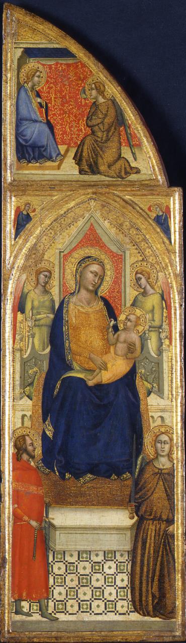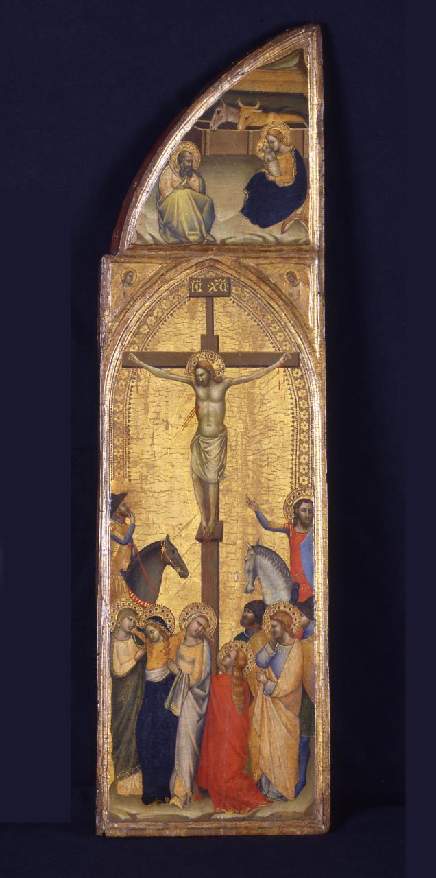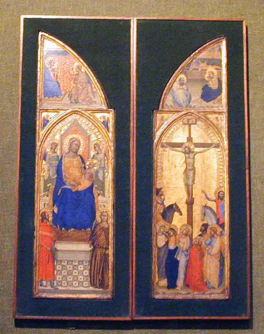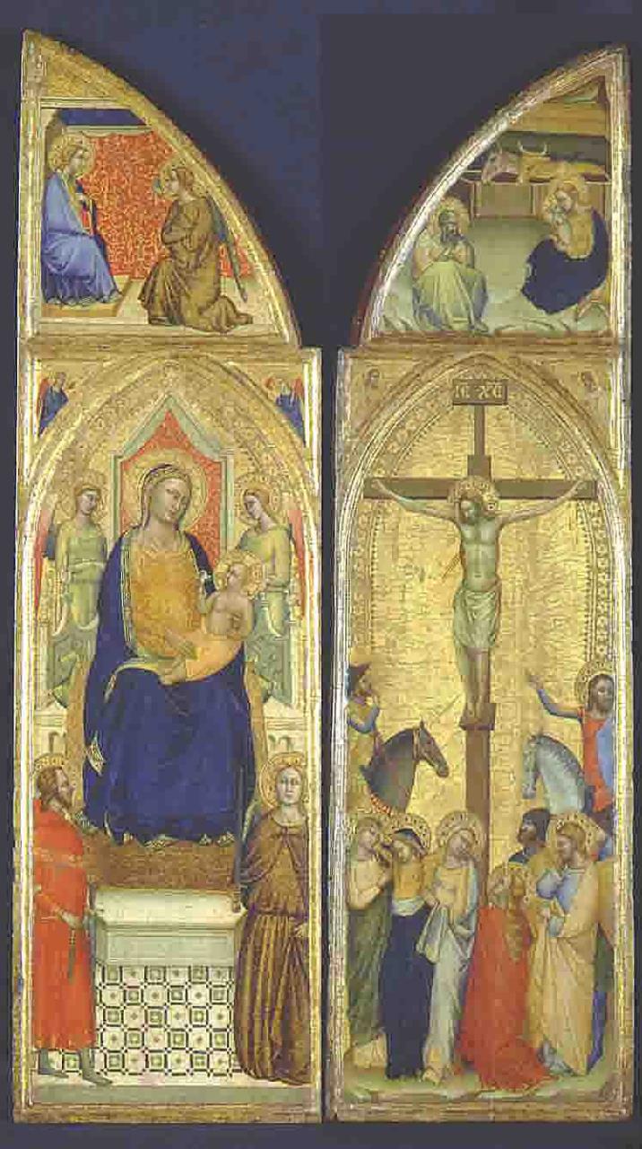 - Left wing: Virgin enthroned with the Christ Child; above, the Annunciation. Right Wing: Christ on the Cross at the foot of which is the Virgin supported by female saints, Saint Mary Magdalen (right), a kneeling Saint John and other figures; above, the Nativity. In both cases angels in spandrels of arched top. Gold ground. Geometrical design, verso.