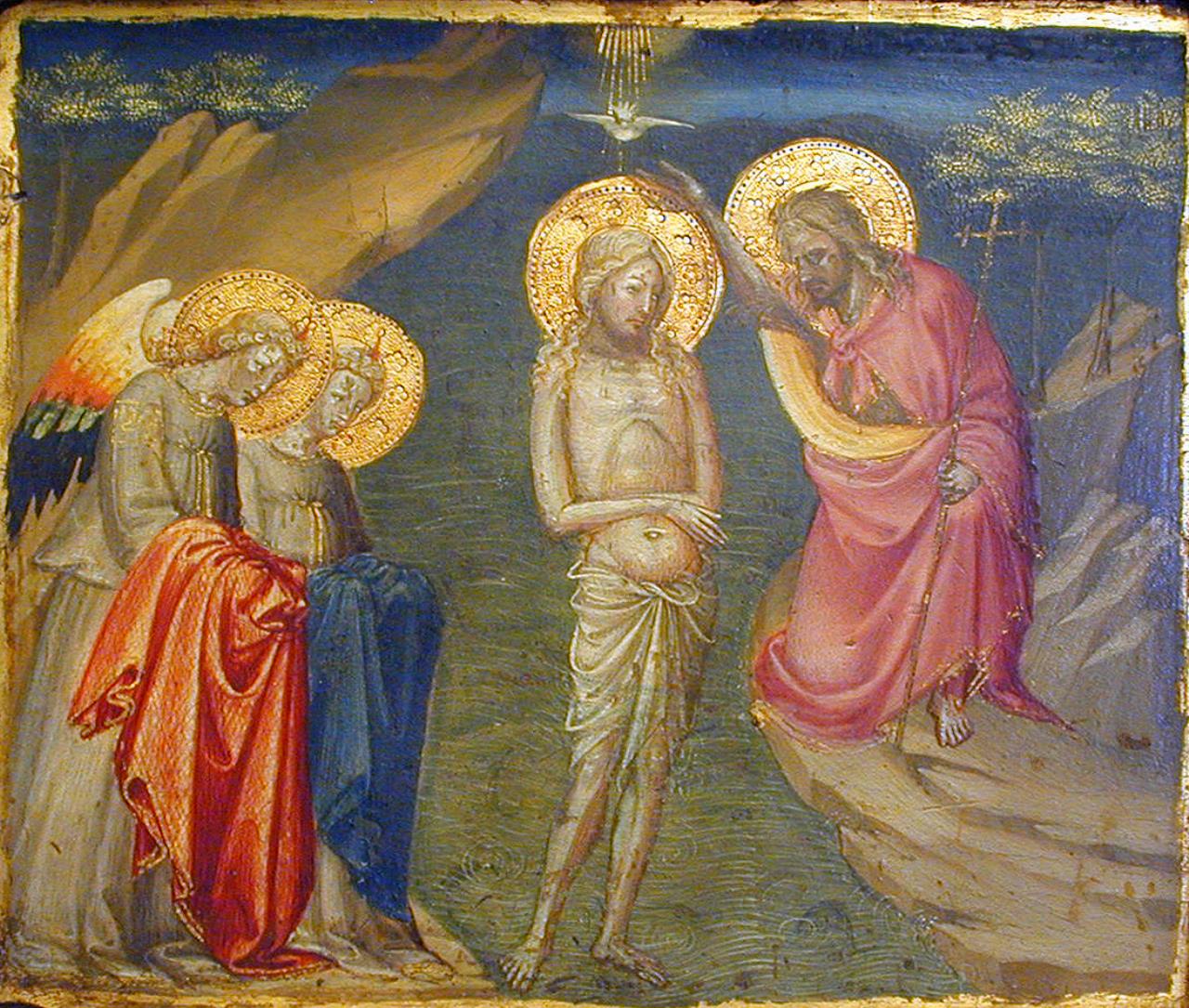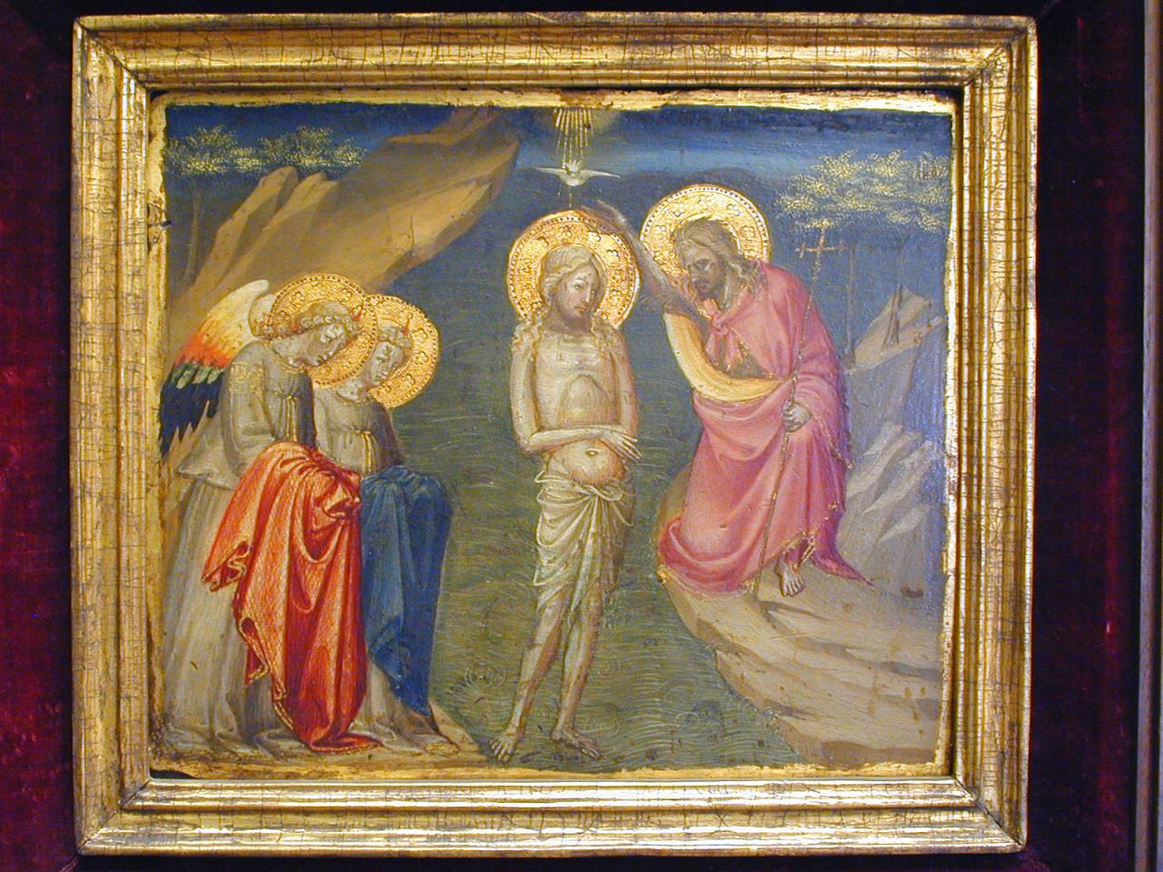 - Christ is in the centre, the Dove above Him: two angels holding cloaks are on the left: on the right Saint John kneels.