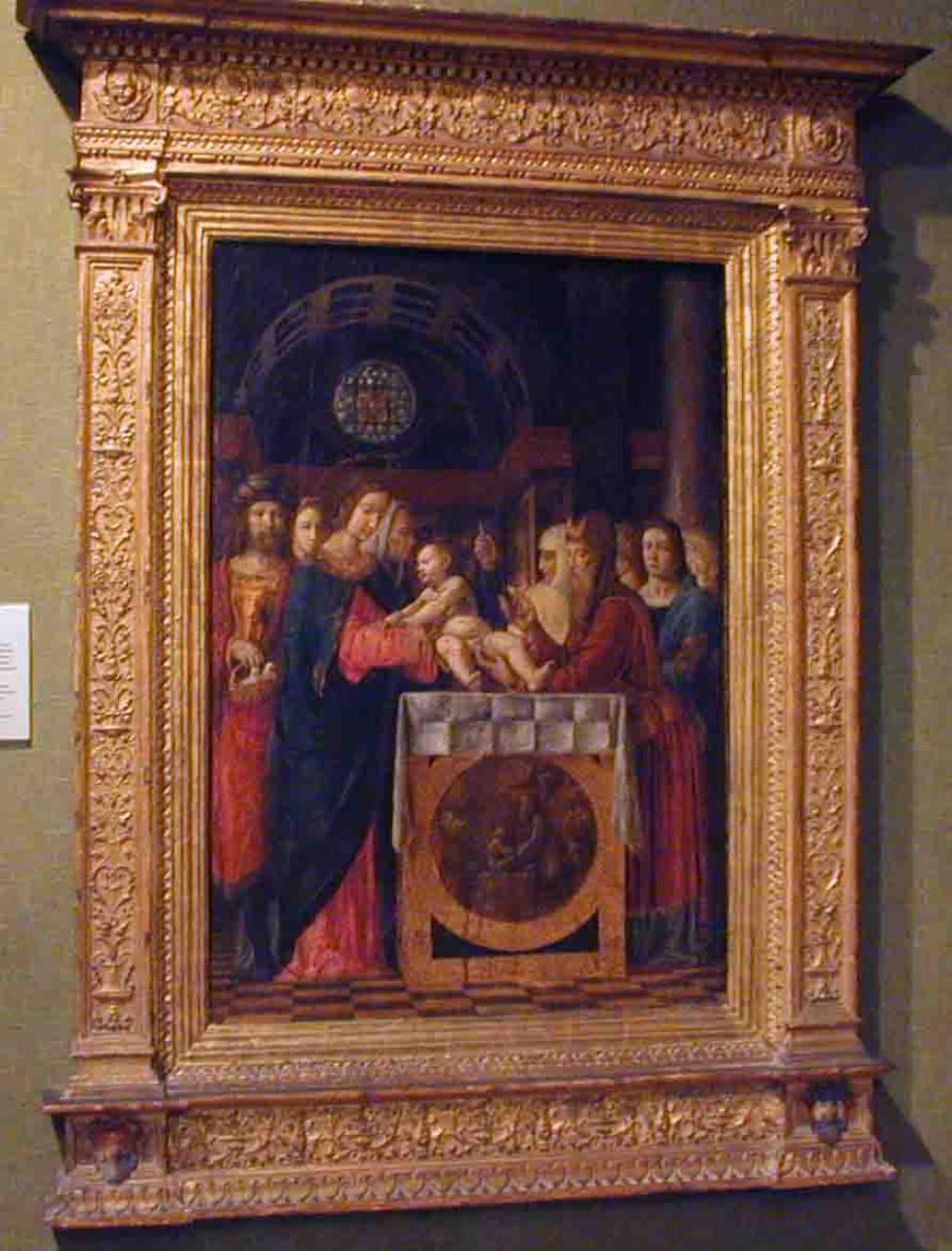 - The Virgin holds Child over a marble font, priest on the right; and left, onlookers; background of classical columns and niche; the sacrifice of Isaac is depicted in roundel form on the font.