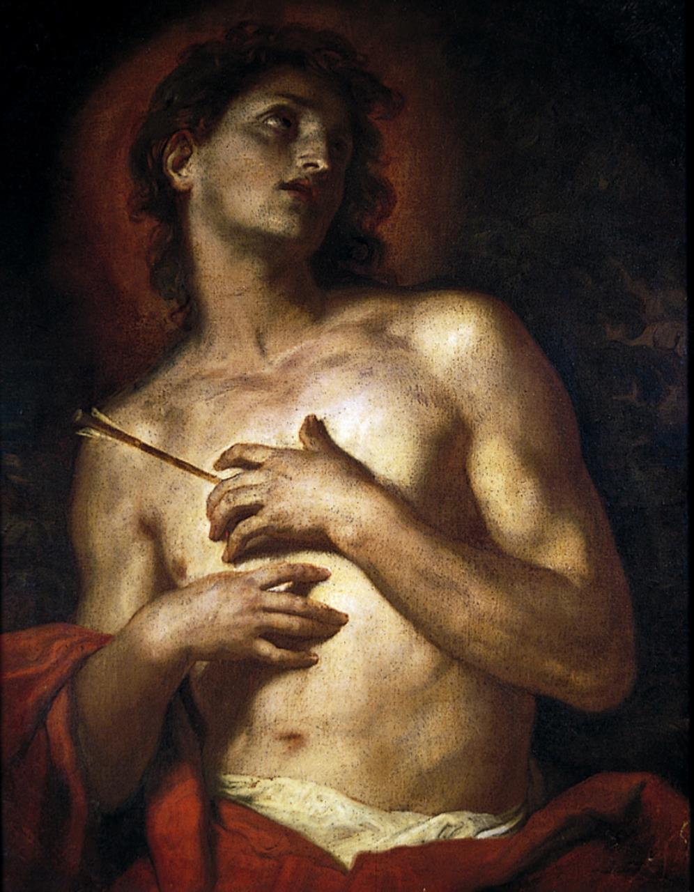 - The Saint gazes upwards on the right, with hands across his chest, his breast pierced by an arrow.