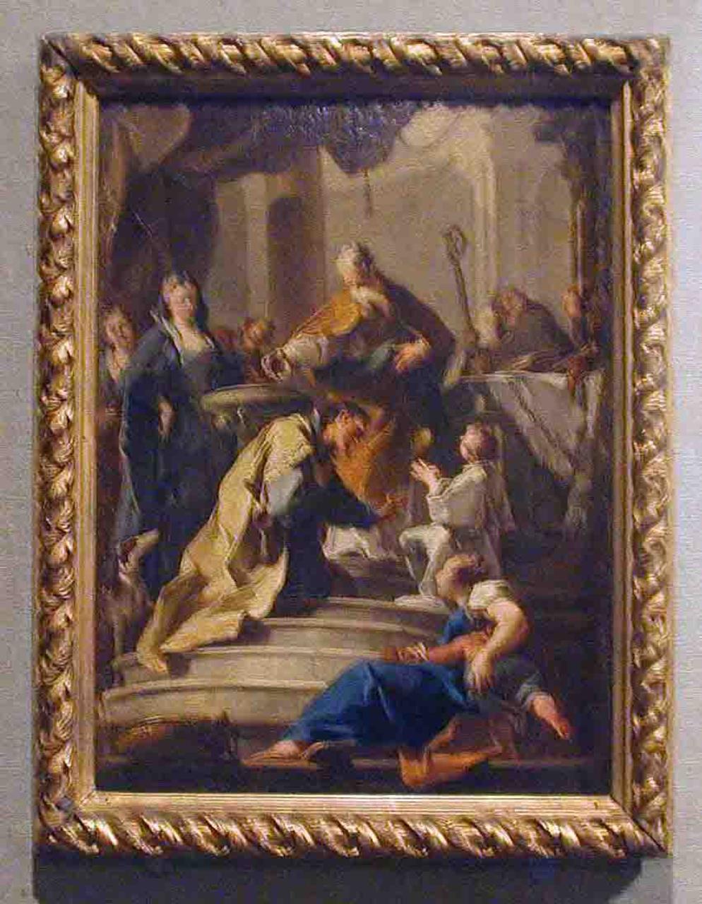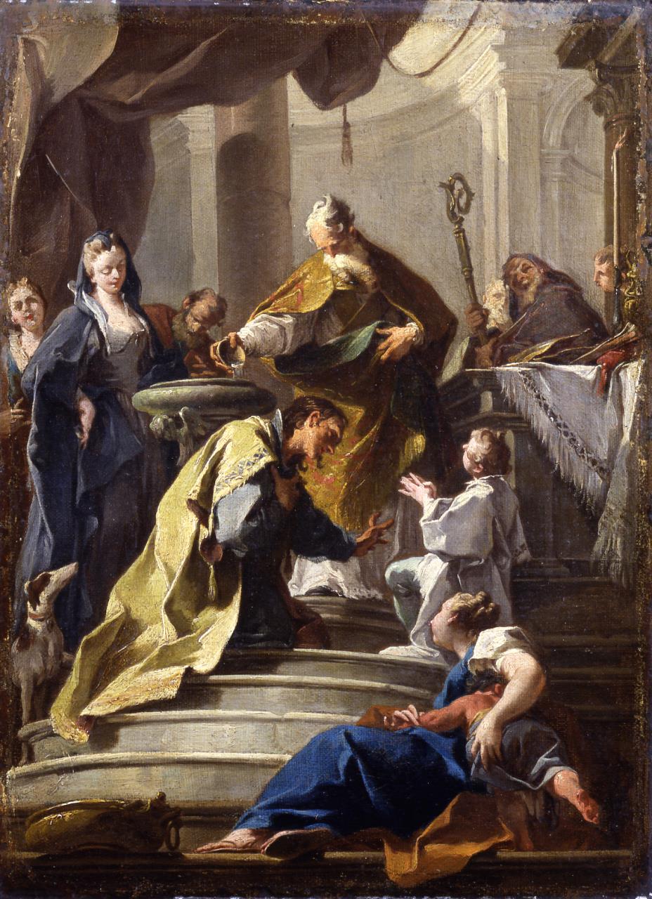 - The ceremony takes place at the head of a flight of stairs: Saint Prosdocimus, Bishop of Padua, is in the act of baptising Saint Daniel who kneels on the stairway: to the left of Saint Prosdocimus stands Saint Justina with a dog: at the base of the stairs, right, woman with putti: background, classical pilasters and entablature.
