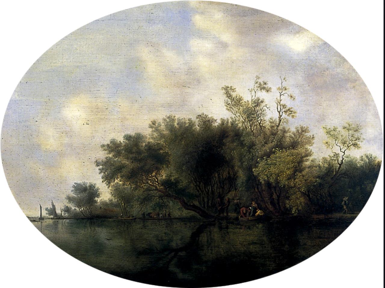 - A river with fishermen in their boats near the bank which is wooded and where more small figures can be seen.