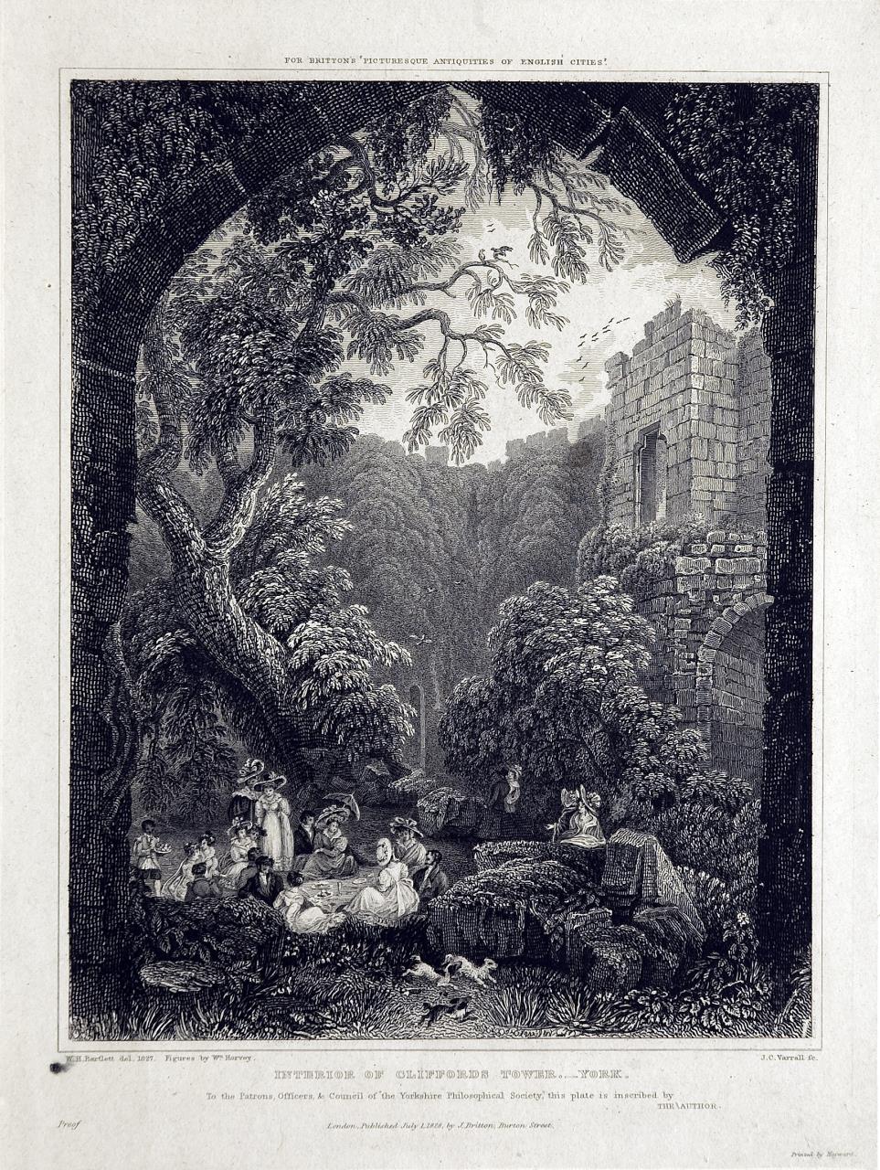 - Etching on steel of the interior of Clifford's Tower, York. A Romantic scene of people picnicing within the overgrown tower during its phase as a garden feature.