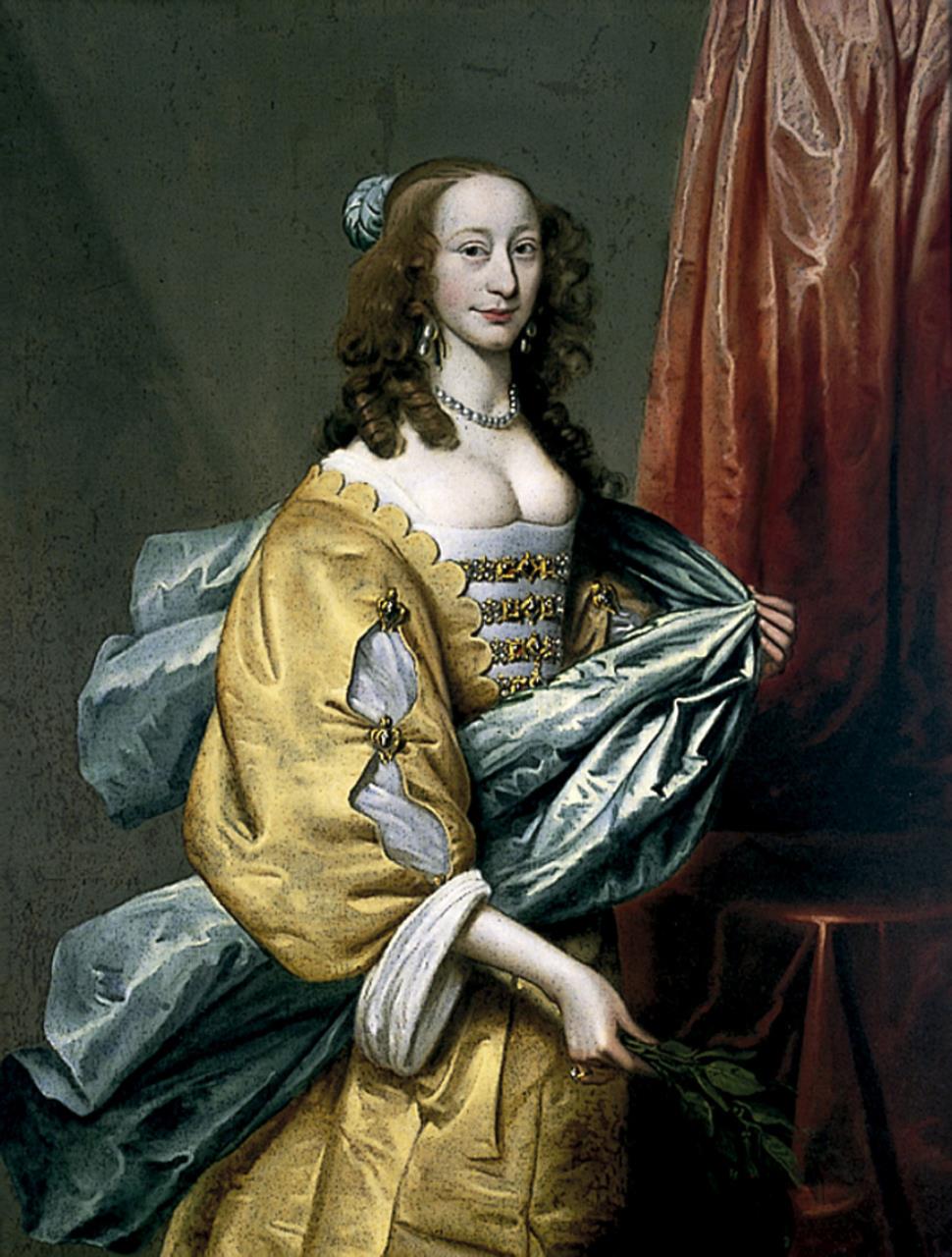 - Three-quarter length figure looking half right; she wears a d?llet?ress with slashed sleeves; with her left hand she carries a silken shawl. There is a red drapery hanging, right.