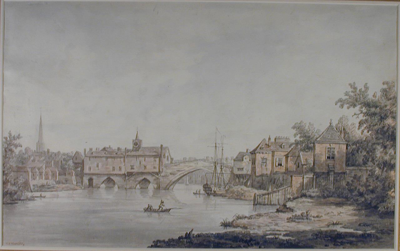 - A view looking down the Ouse towards Ouse Bridge; on the left Saint William's Chapel, extreme left the tall spire of Saint Mary's; a masted ship is moored near to the bridge, and small boats are manned on the water. Verso: a collector's stamp and a pencil line drawing of a bay, or plane. Cliffs to the left foreground and distance, both left and right: figures standed and mounted on horseback, lower right. A line of tents and temporary structures in the middle distance, traversing the image.