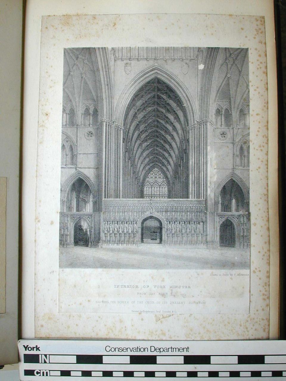 - A view of the interior of York Minster, showing the choir screen from the nave. The print has a detachable lower half, showing alternative views of the choir screen and side aisles. Within an album.