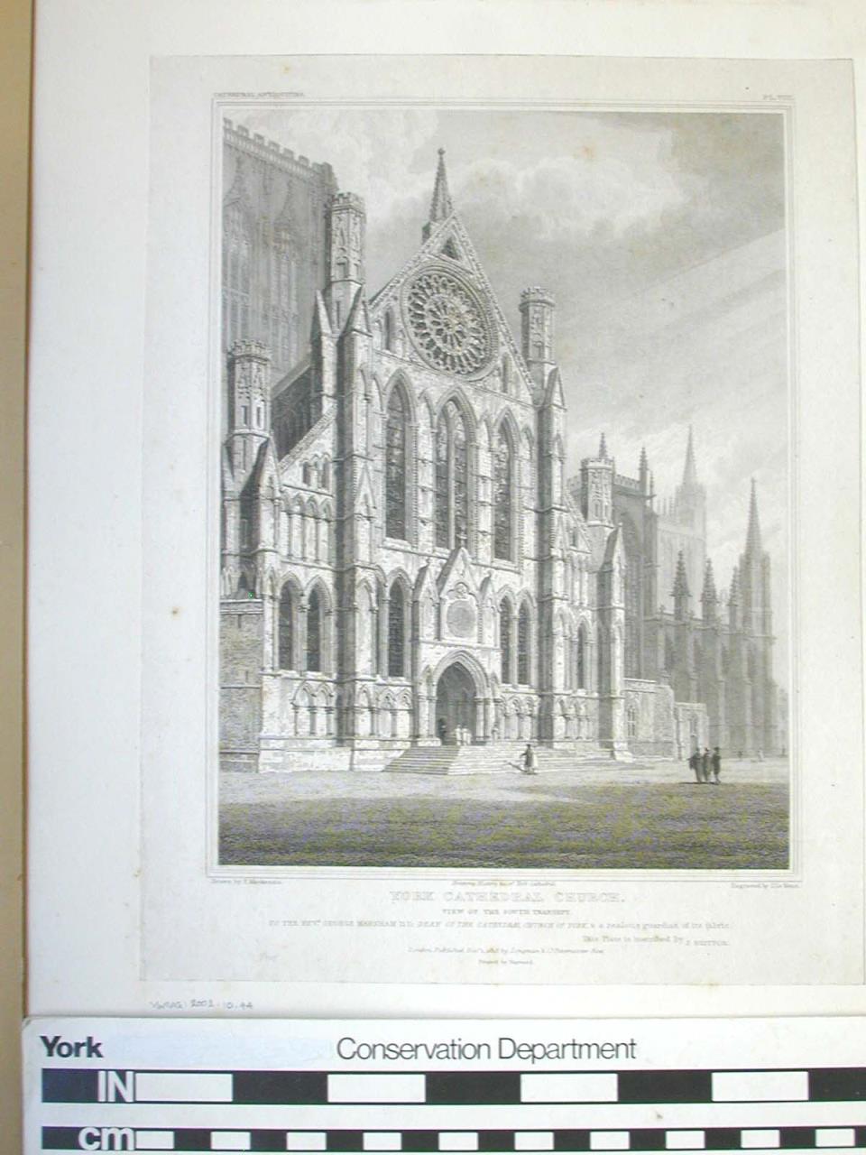 - An engraved view of the south transept of York Minster, with figures standing in front of the entrance.