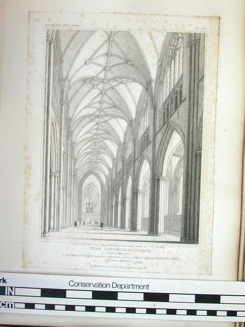 - An engraved view of the interior of York Minster, looking up the nave, with a row of arches running along the right. People are walking in the nave in the left background.