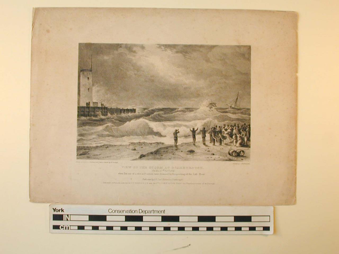 - A lithograph of a storm and shipwreck at Scarborough. A crowd stands on the beach in the right foreground, watchinga a boat and ship in the right background. A lighthouse stands on the left.
