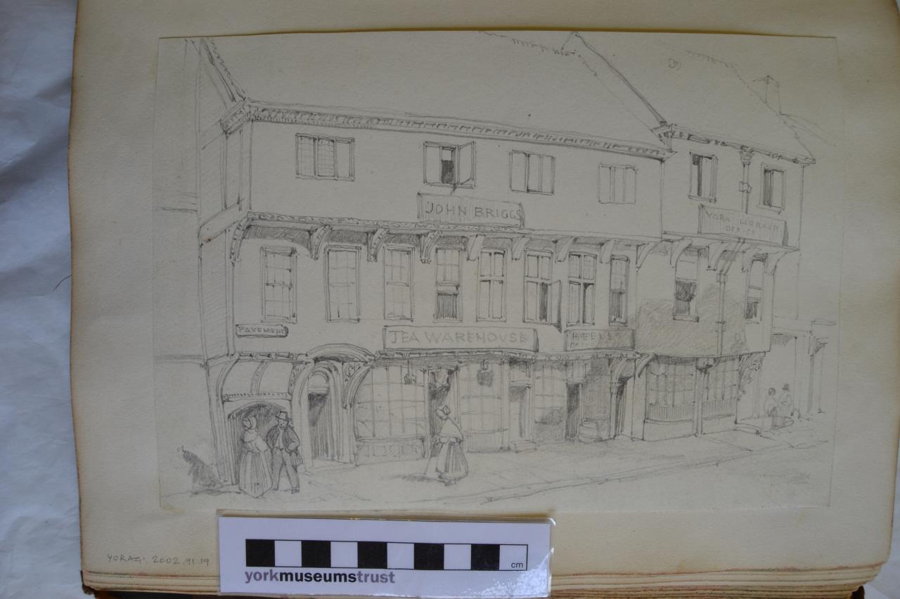 - A pencil drawing of the facade of a timber-framed, jetted buildings on Pavement, York. Signs on the buildings indentify the establishments as John Briggs, Tea Warehouse and the York Herald Office. Figures stand in front of the buildings.