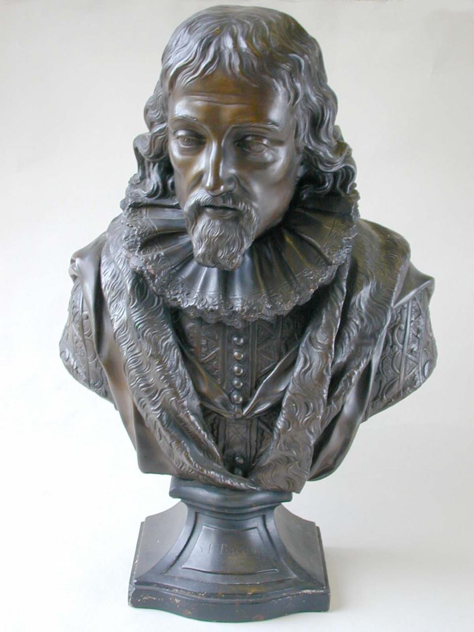A bronzed plaster bust, one of a series of nineteen featuring artists, philosophers and writers. This bust is of Sir Francis Bacon, wearing a fur-trimmed robe and a ruff collar. The moulded plinth has a name plate on the front.
