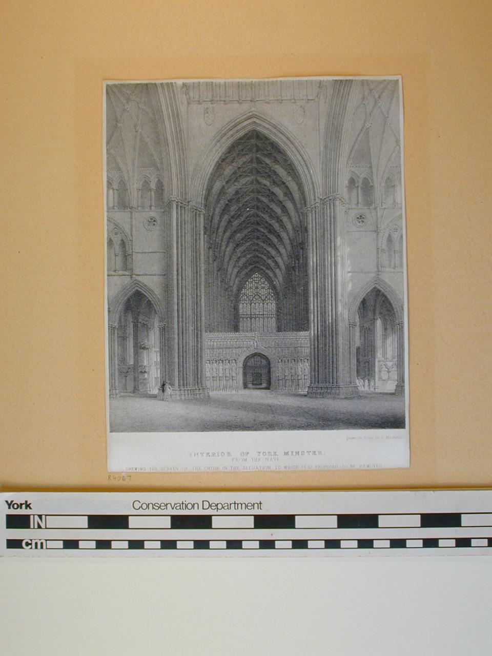- A view of the interior of York Minster, showing the choir screen from the nave. The print has a detachable lower half, showing alternative views of the choir screen and side aisles.