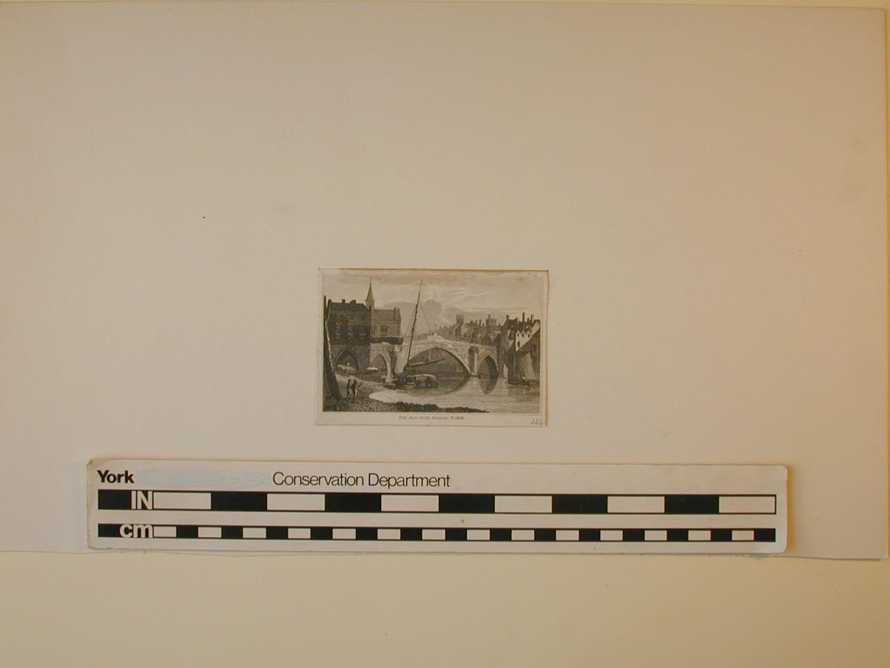 - A small engraving of the Old Ouse Bridge, York, with Saint William's Chapel stood on the far right. A ship is unloading on the shore in the left foregorund.