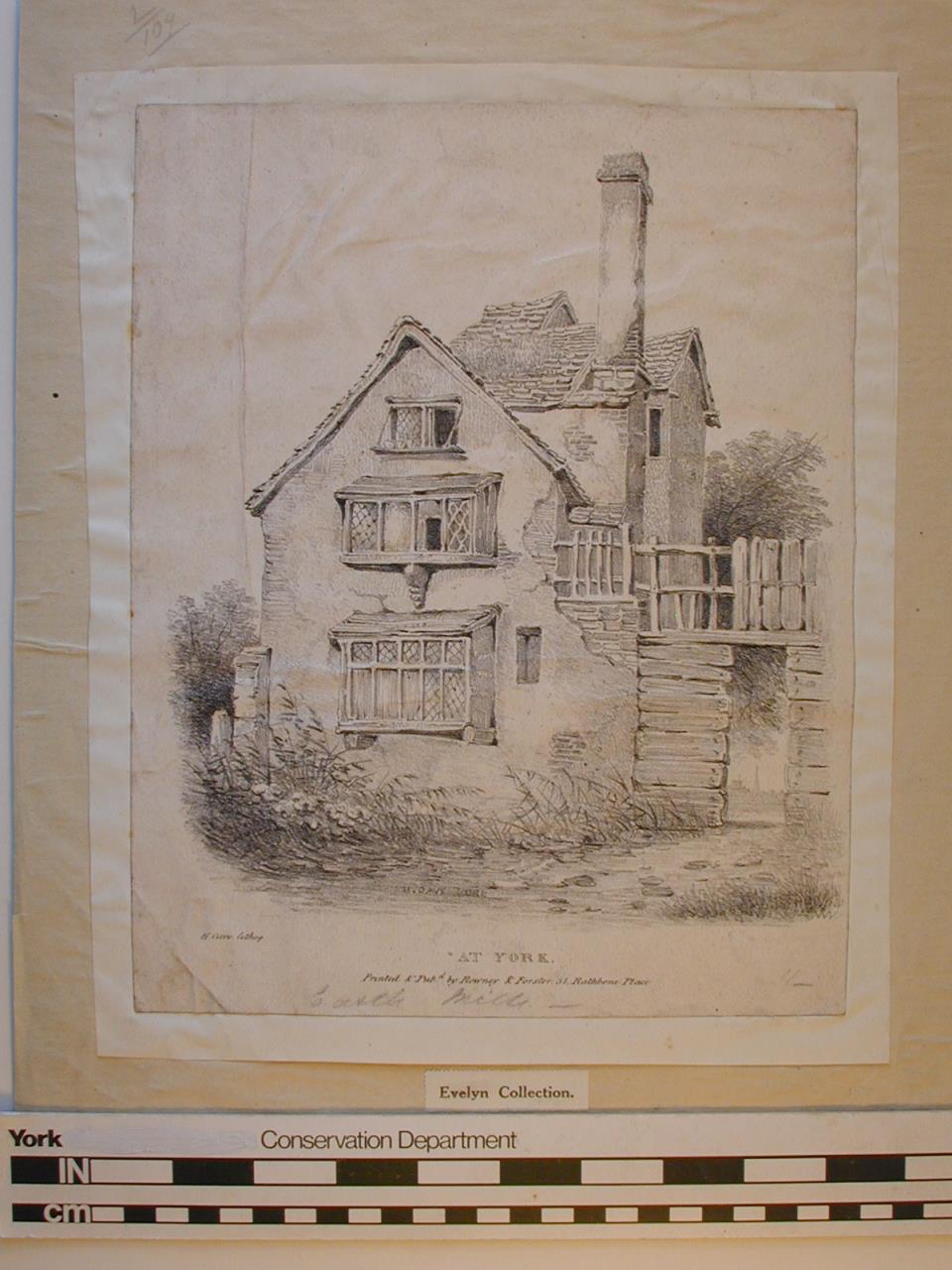 - A lithograph of a ramshackle three story building, possibly Castle Mills, York.