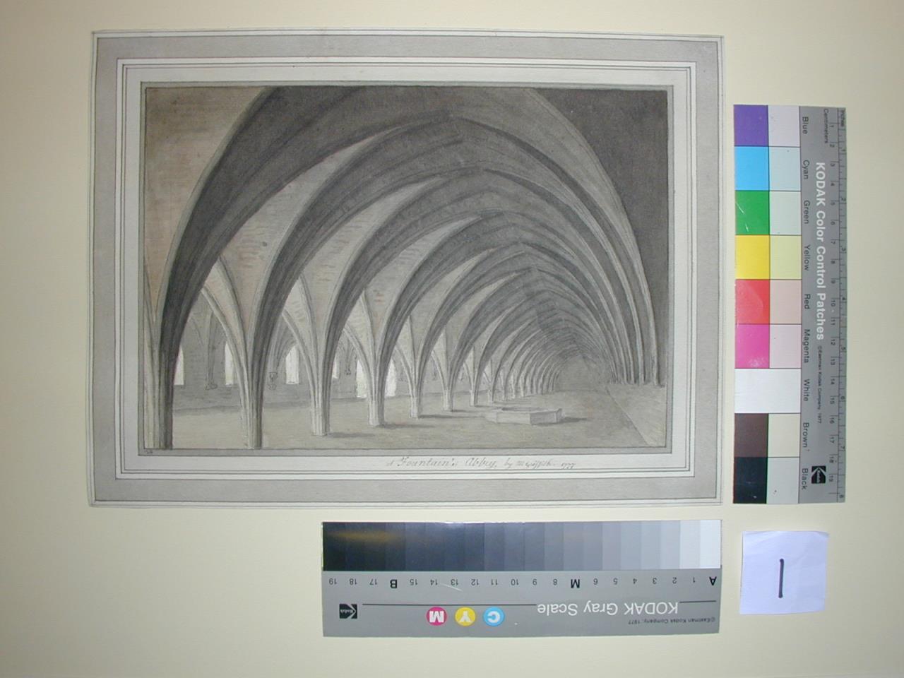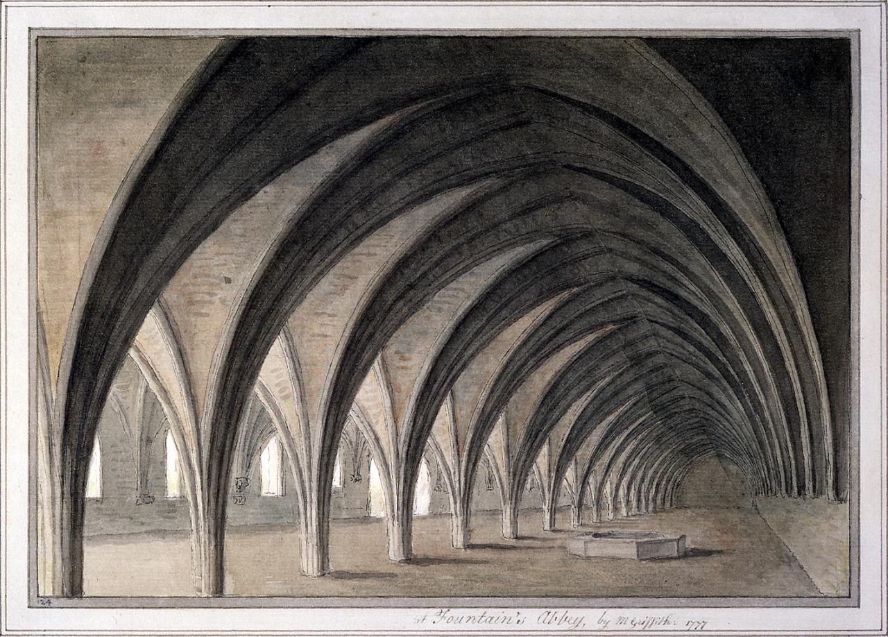 - Wash and ink drawing of the undercroft of Fountains Abbey.