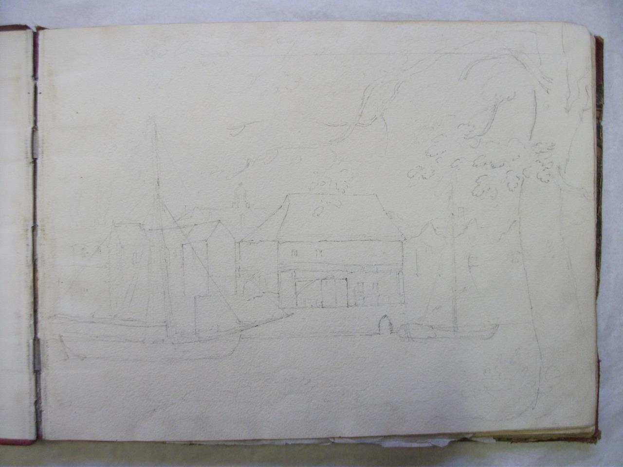 - Faint pencil drawing across a river with two sailing boats, warehouse buildings, and a tree in the right foreground.