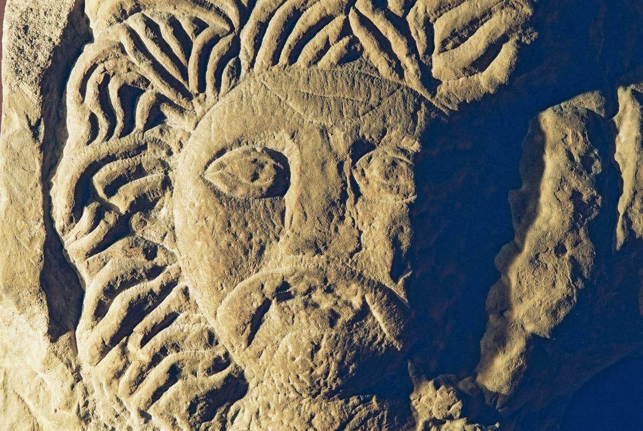Face of celtic god in relief, moustache and mass of hair (or rays - possibly a sun god) around head. Described in Eboracum as "Relief, gritstone plaque, 22ins by 21ins by 5 and 1/2 ins, with a plain frame enclosing the face of a Celtic god, with lentoid eyes and drooping moustache, framed in a wild mass of flowing locks like the Bath Gorgon. Traces of red and white painted are still visible on the stone."