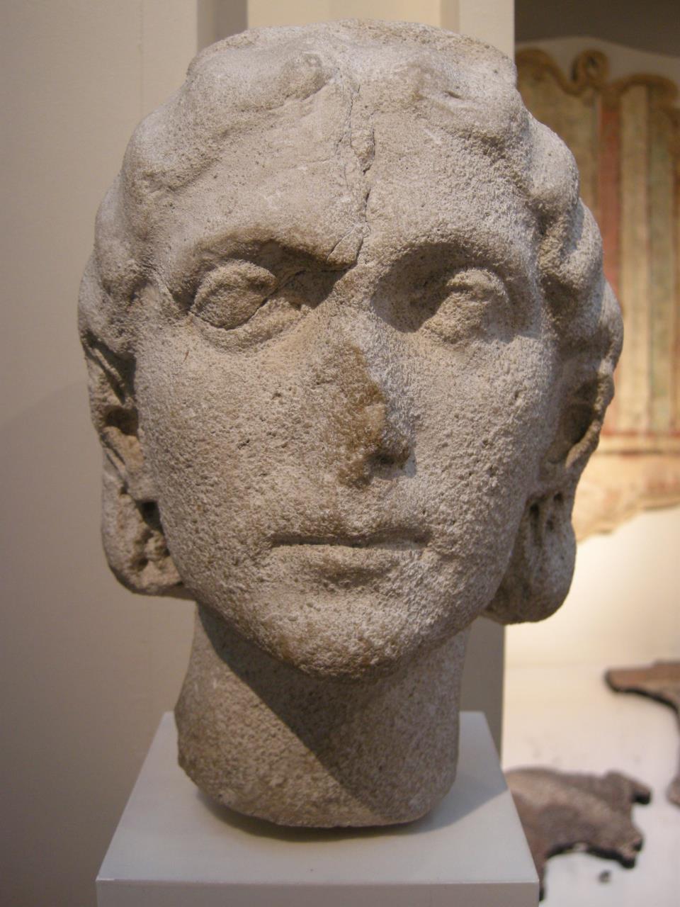 Head of woman with third century hairstyle, probably a funerary monument. Described in Eboracum as "Statue, head, of a woman, life size, 10ins high, in limestone; the nose damaged. Her hair is parted in the middle, waved, drawn back over the ears and turned up behind in a chignon, a style fashionable in the middle of the third century AD. It was probably from a funerary monument."