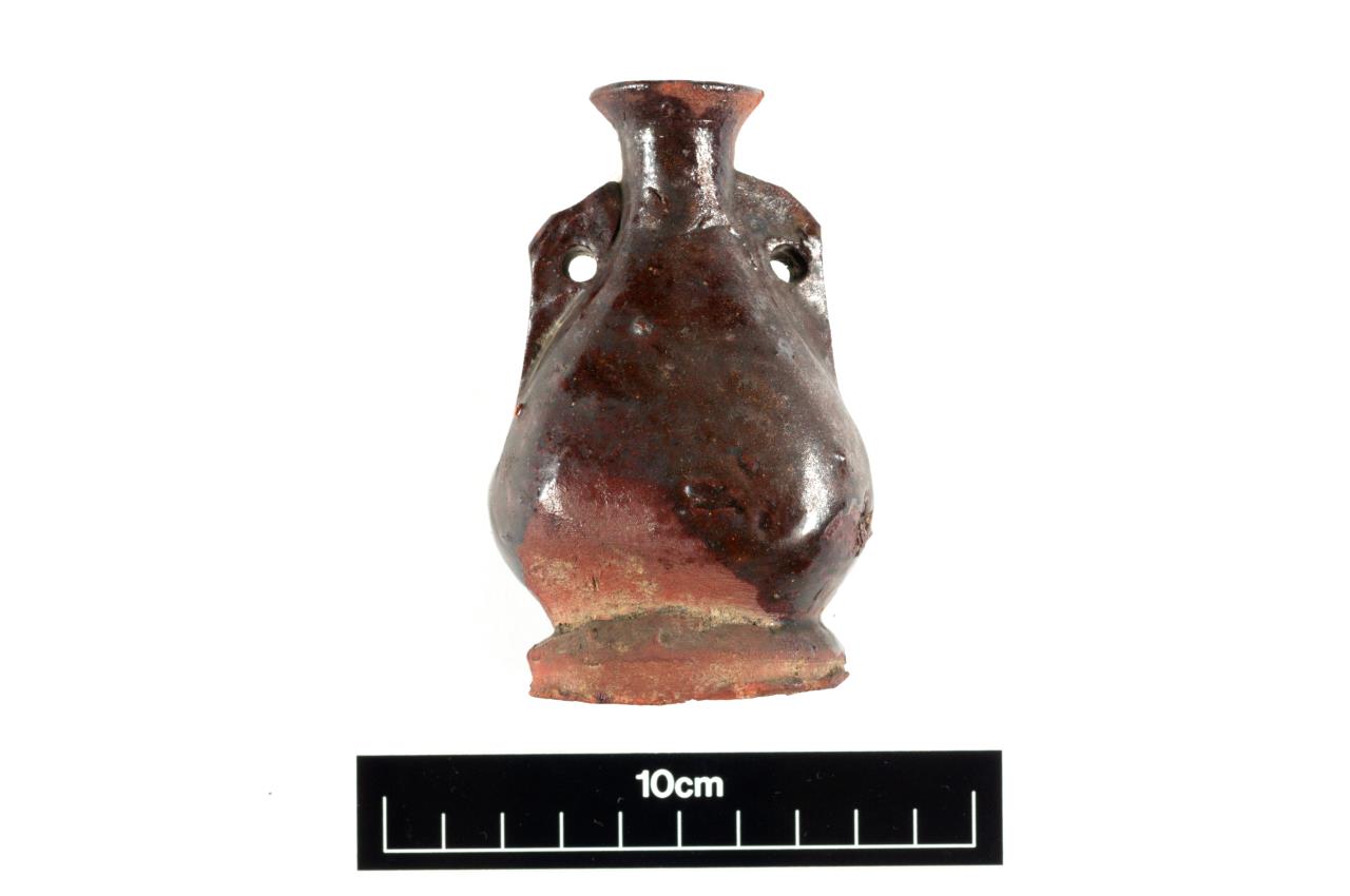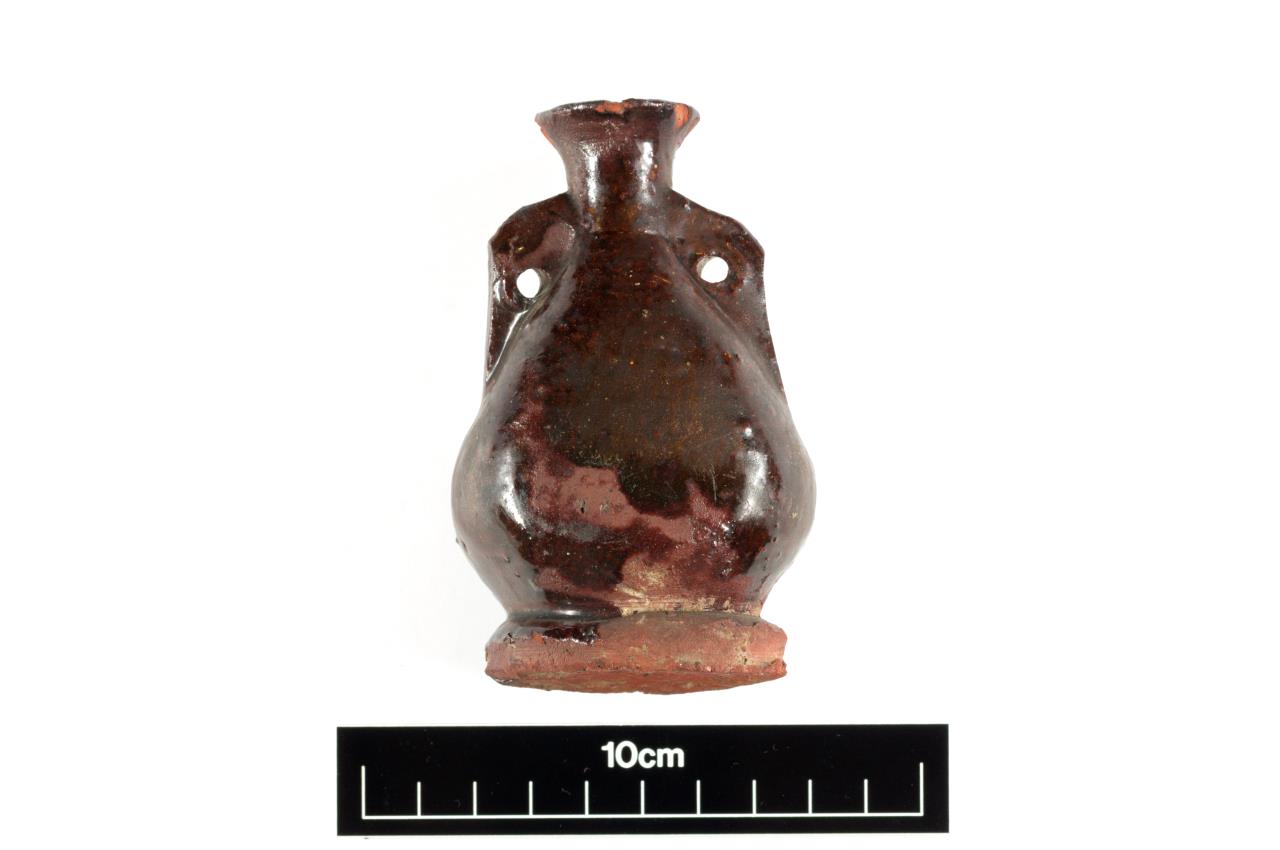 Costrel; squat, earthenware vessel. Bulbous body with a narrow neck and a flared, plain rim. Two hand-moulded shoulder blocks are punched through with a single perforation each to create two handles. The foot is irregular. The body has been squared on on the front and rear faces. Fabric is dark red at the surface. Thick brown glaze covering the interior and exterior, patchy at the foot.