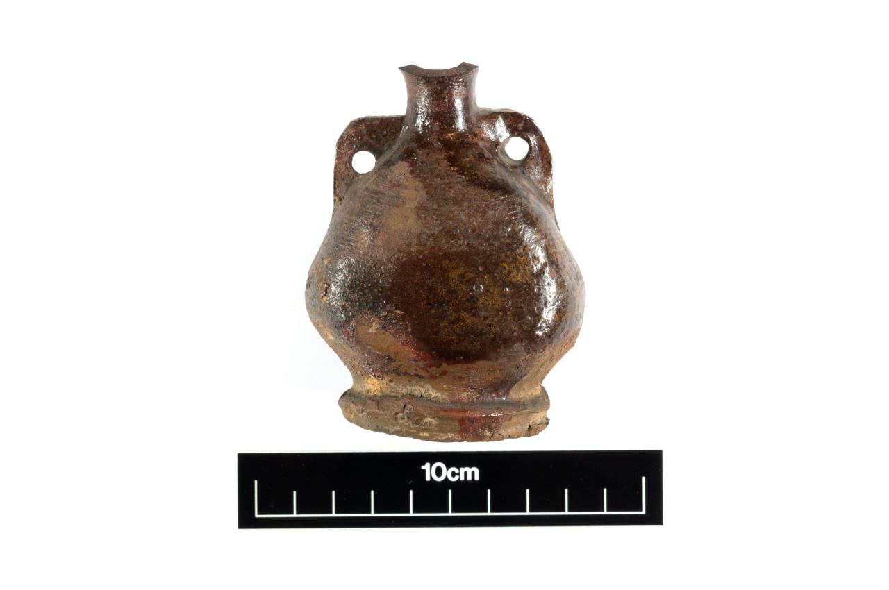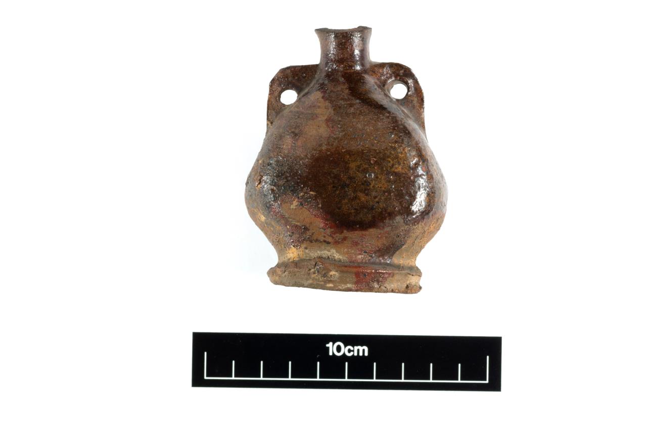 Costrel; squat, earthenware vessel. Bulbous body with a narrow neck, rim missing.Two hand-moulded shoulder blocks are punched through with a single perforation each to create two handles. The foot is irregular. The body has been flatenned diagonally on on the front and rear faces. Fabric is brown at the surface. Thick brown glaze covering the interior and patchily at the exterior, abraded on all surfaces.