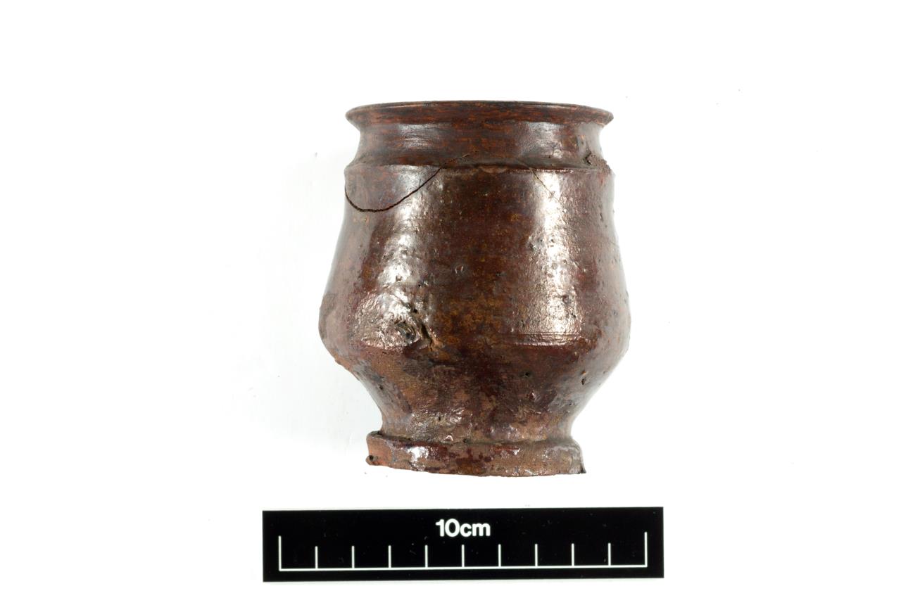 Pedestal cup; earthenware vessel. Bulbous body tapering towards the wide, everted rim. A single raised rib is evident at the shoulder. The foot is irregular. A thick brown glaze, mottled with pale brown, covers the interior and exterior. The rim is partially reconstructed.