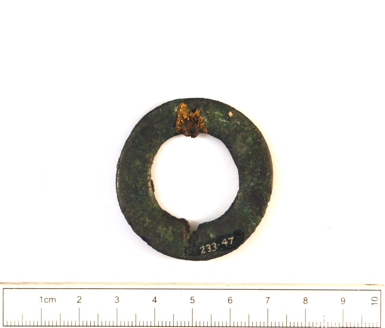 - Flat in section with small punched circle decoration on the inner and outer edges. A small indentation on one end, and opposide a punched hole.