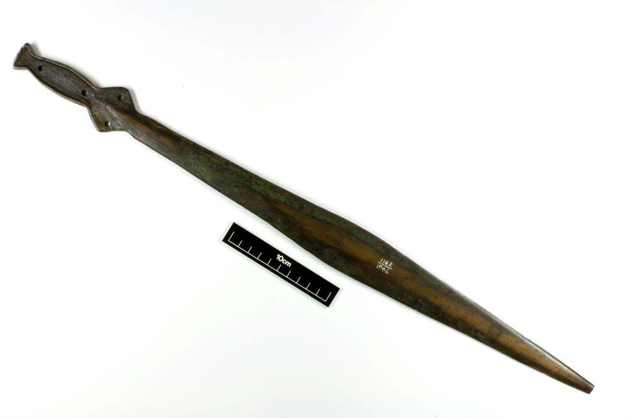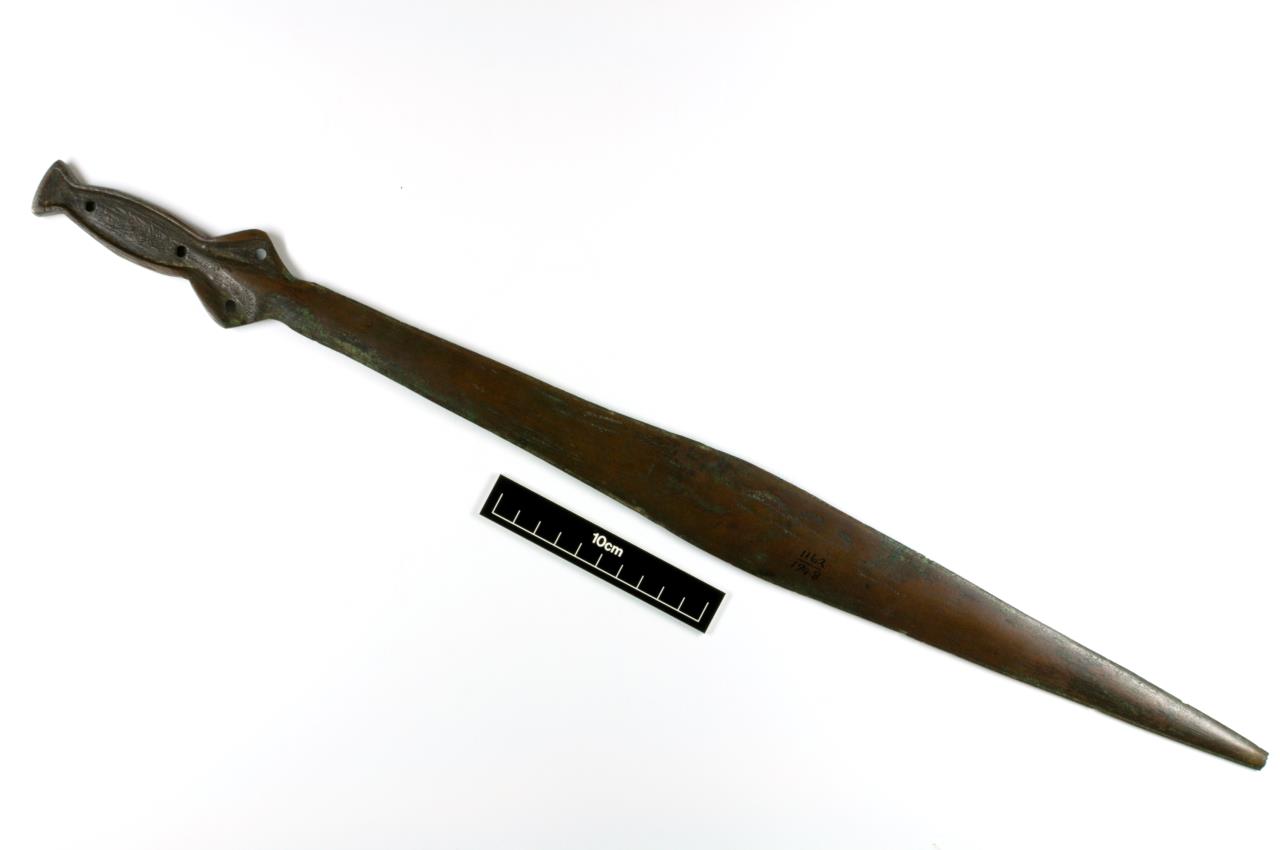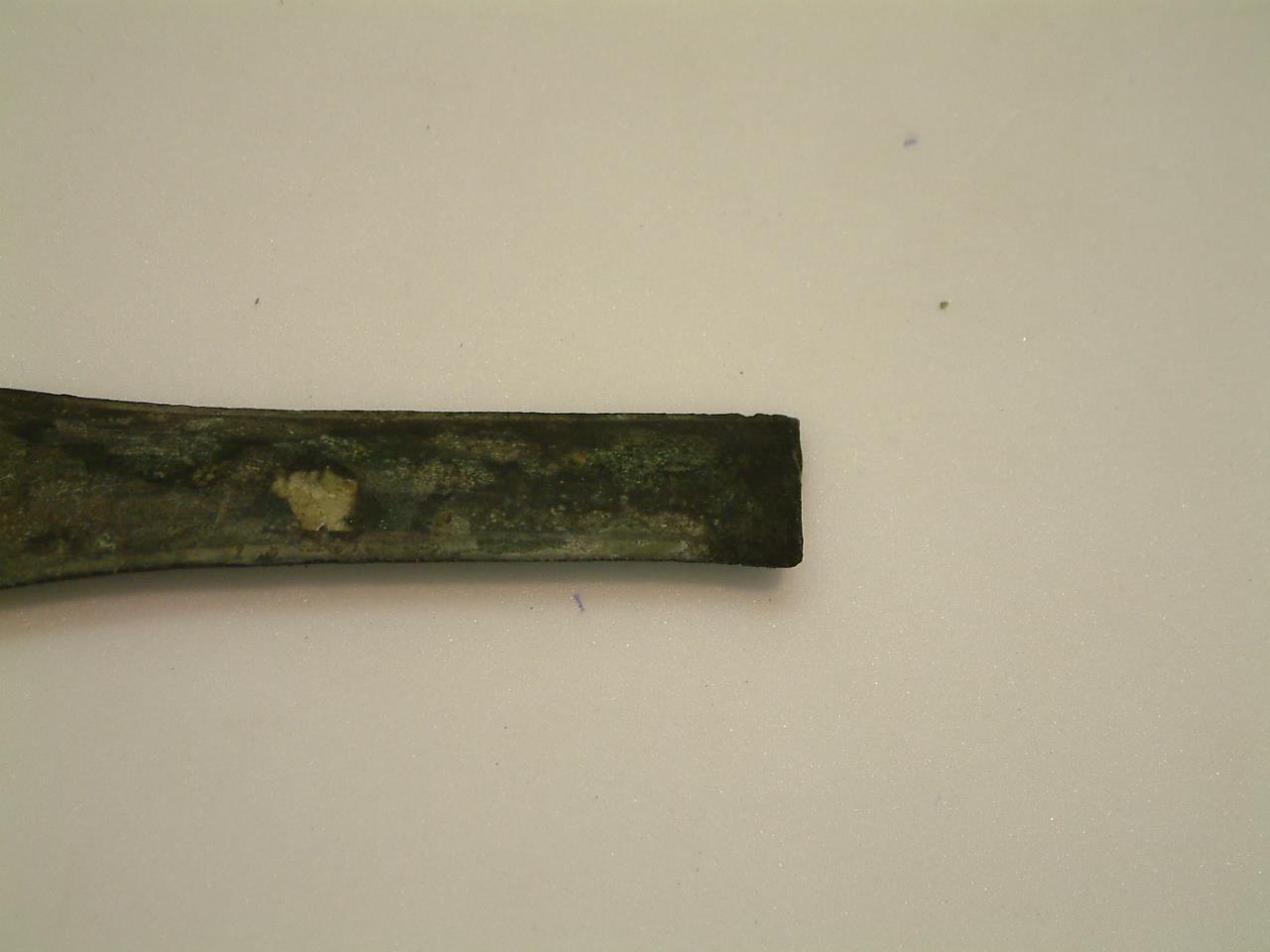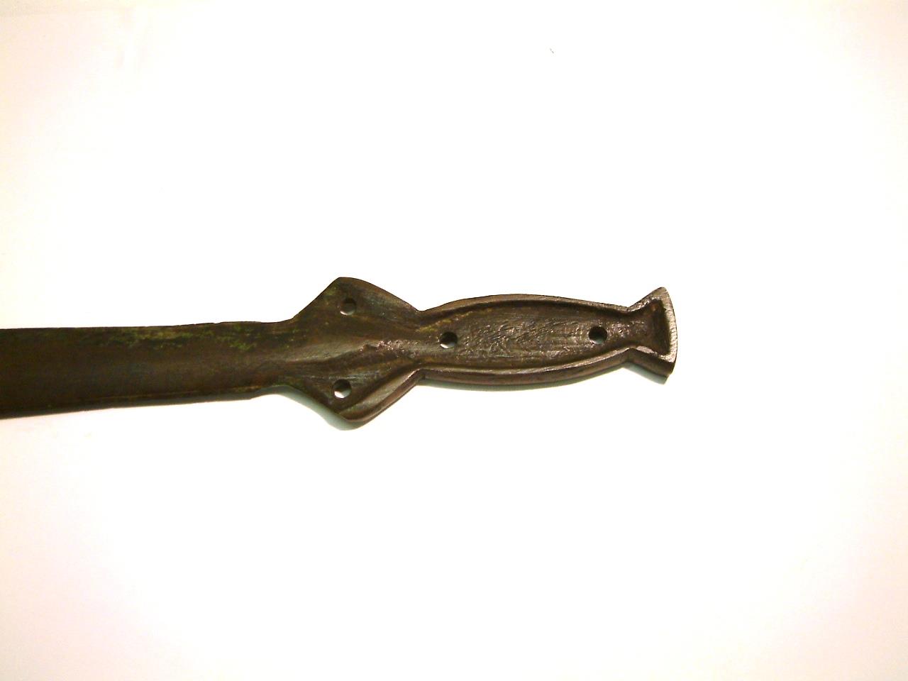 Leaf-shaped blade and T-shaped handle, 4 rivet holes, 2 on handle 2 on shoulders. There is a thick raised retainer around the grip and pommel extending to the upper part of the shoulders. The blade has a recessed cutting edge which shows some damage, the tip is also missing, but the rest is in good condition.
