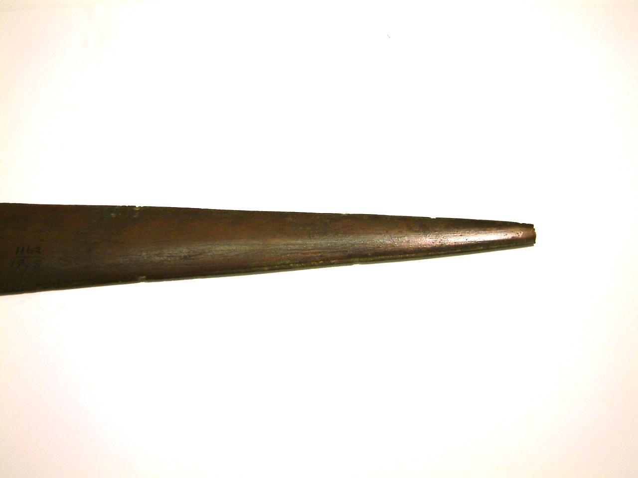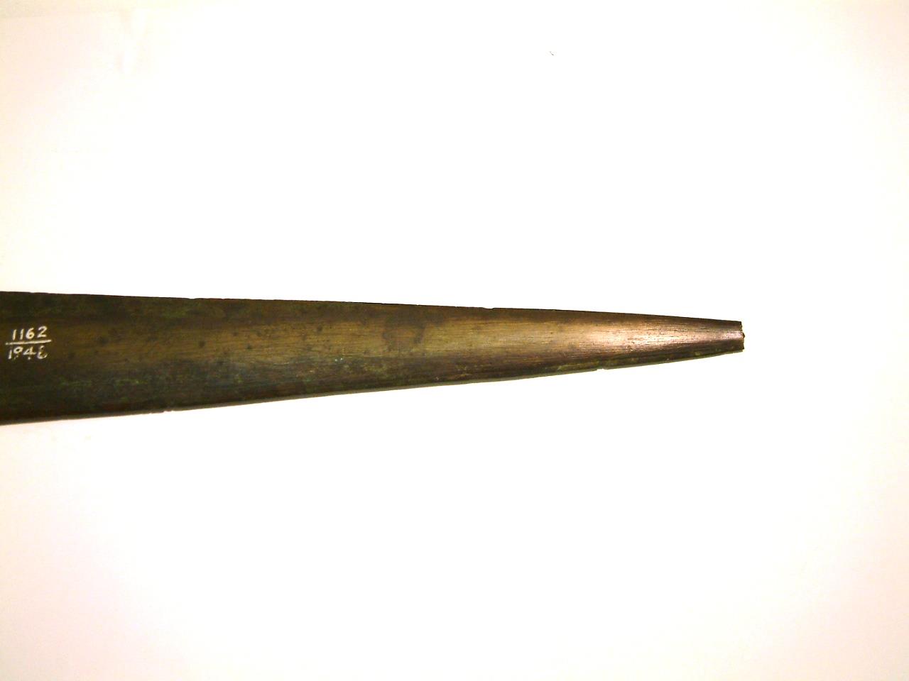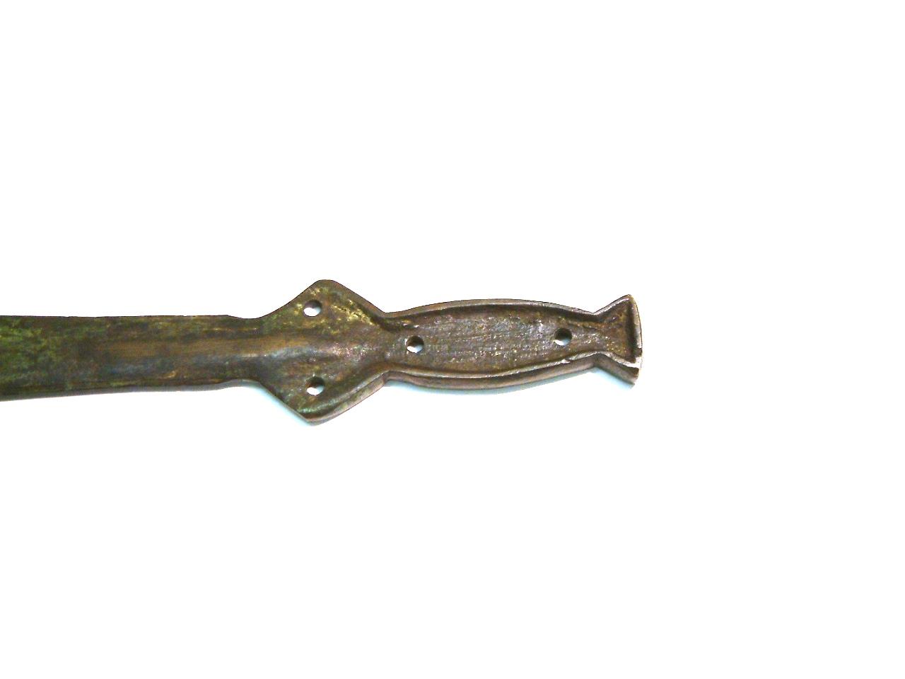 Leaf-shaped blade and T-shaped handle, 4 rivet holes, 2 on handle 2 on shoulders. There is a thick raised retainer around the grip and pommel extending to the upper part of the shoulders. The blade has a recessed cutting edge which shows some damage, the tip is also missing, but the rest is in good condition.