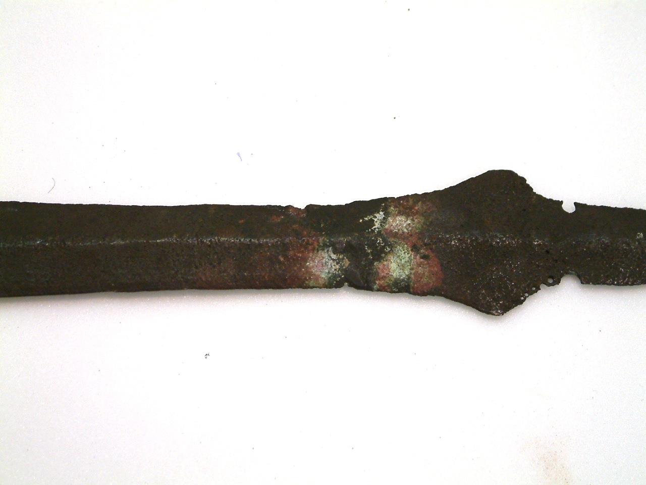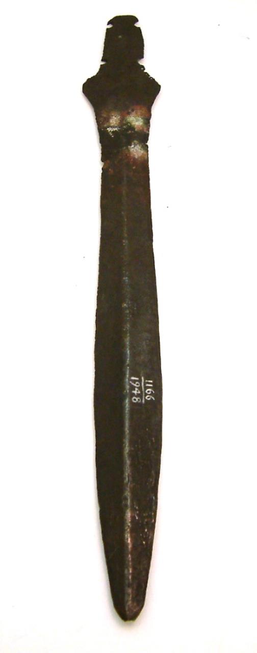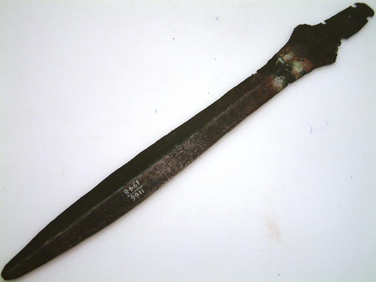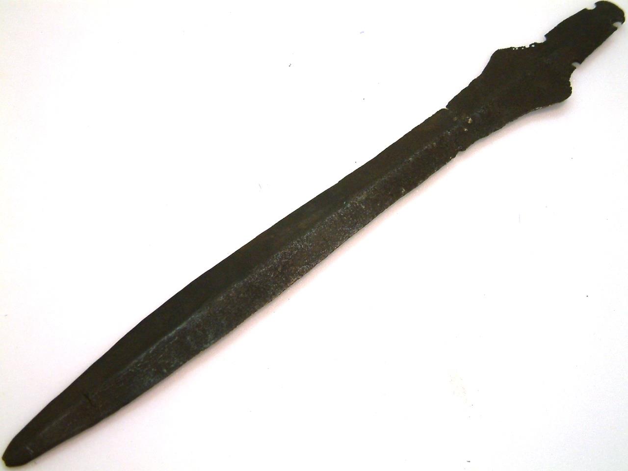 Short sword with leaf-shaped blade. 4 rivet holes in the tang, diamond shaped shouldersbelow which is a repaired crack , A high keel runs the length of the blade, which has a significant chip in one edge and is missing its tip. There is some corrosion on the blade and a large area of discolouration aroung the fixed crack. There are also a number of holes running down one shoulder.