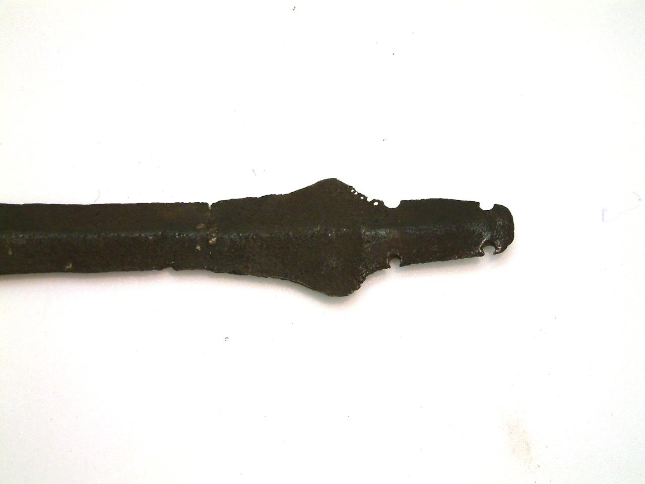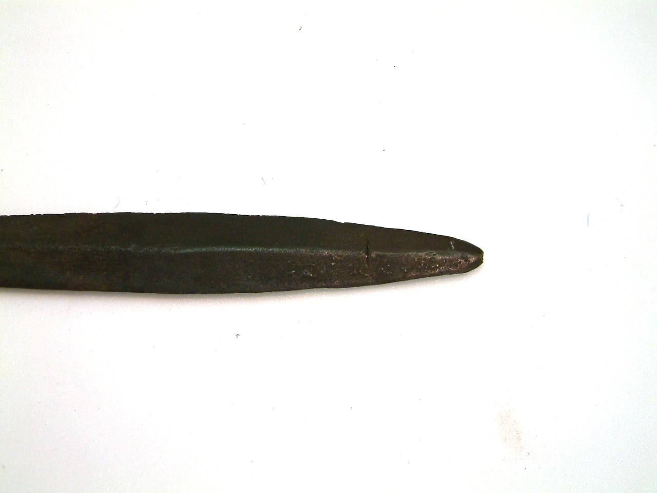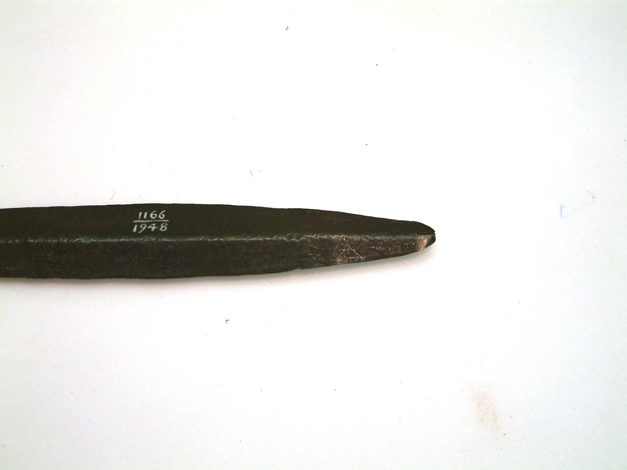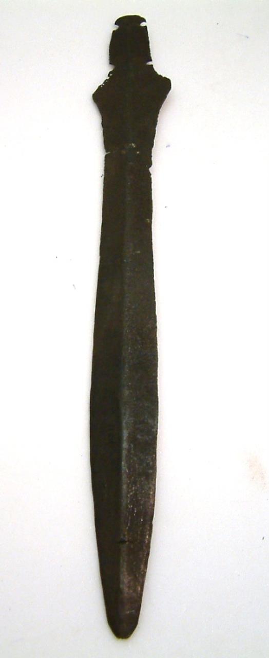 Short sword with leaf-shaped blade. 4 rivet holes in the tang, diamond shaped shouldersbelow which is a repaired crack , A high keel runs the length of the blade, which has a significant chip in one edge and is missing its tip. There is some corrosion on the blade and a large area of discolouration aroung the fixed crack. There are also a number of holes running down one shoulder.