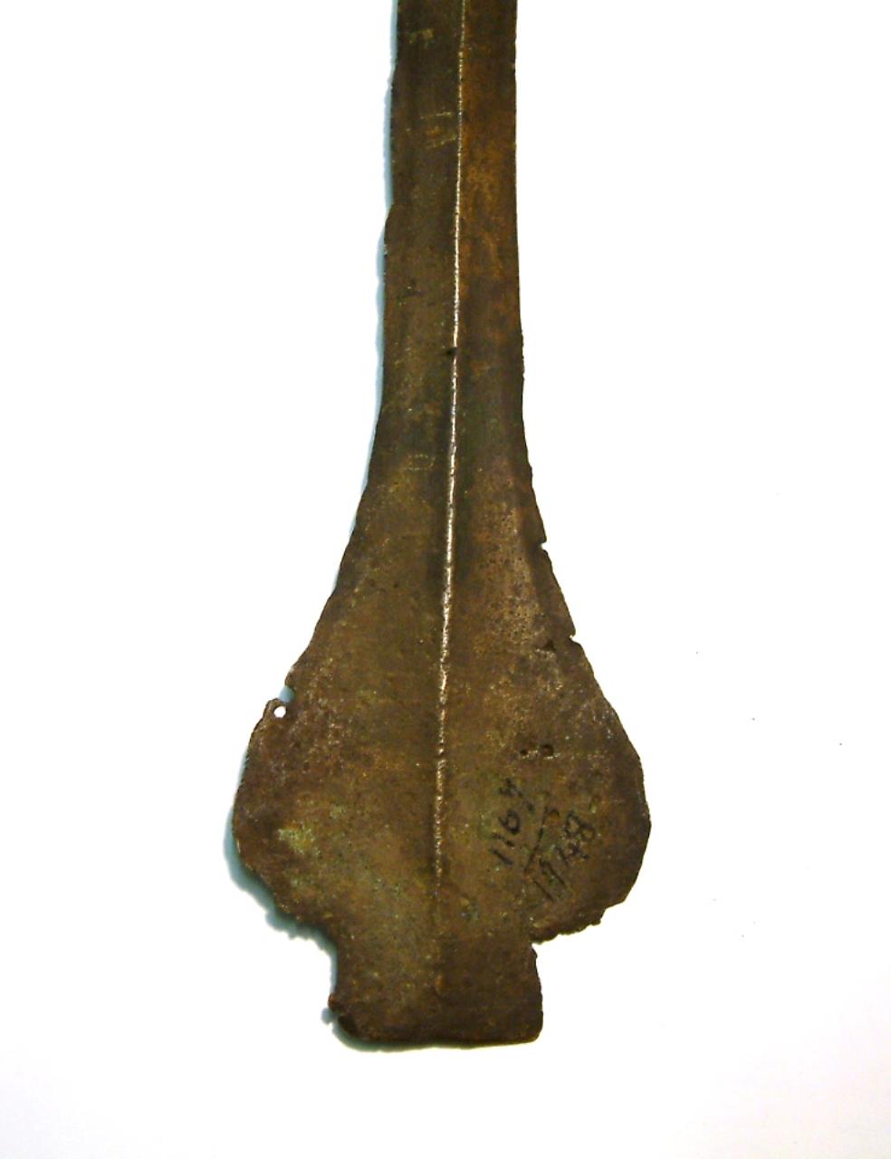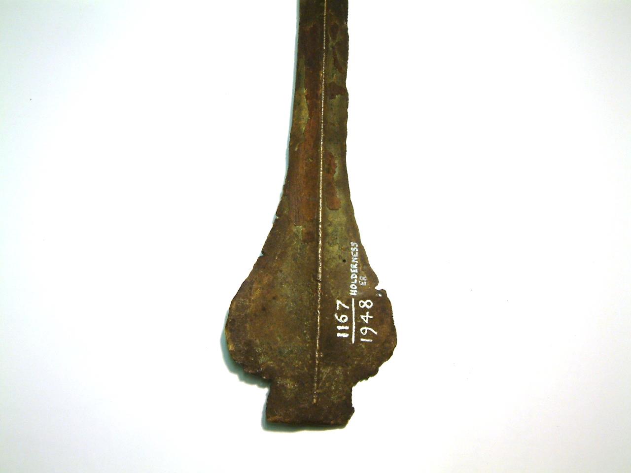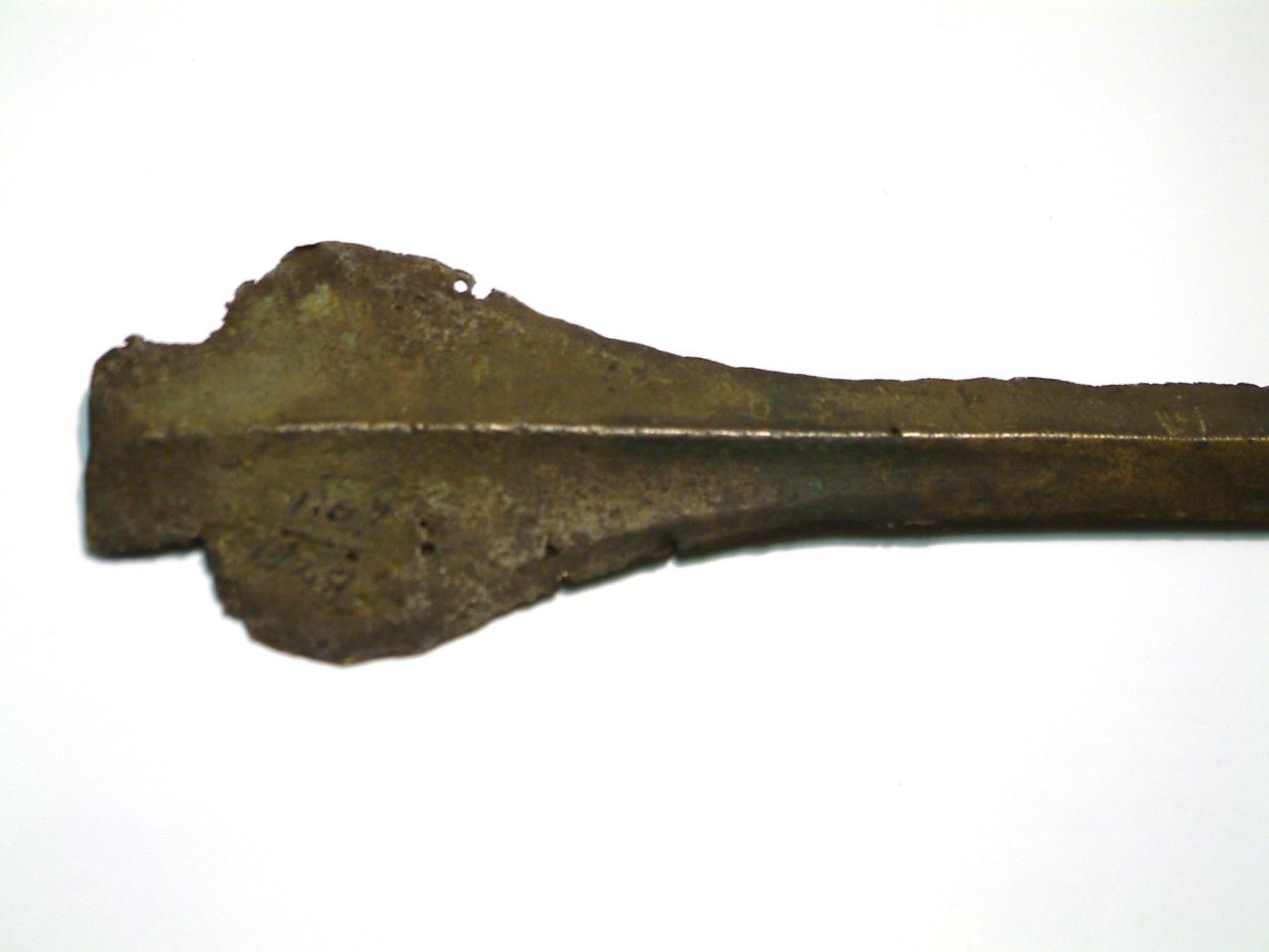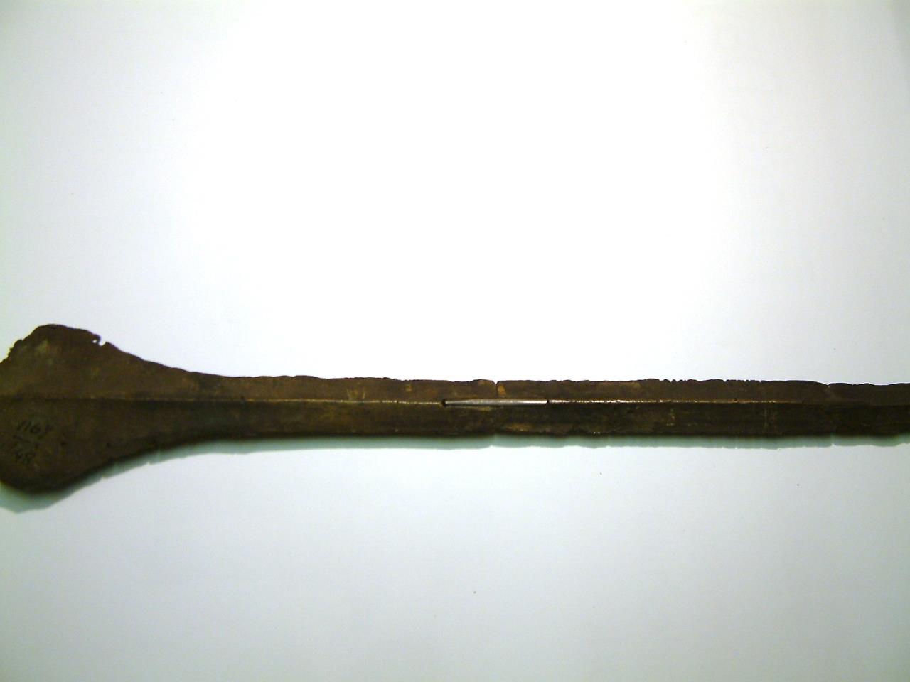 Narrow blade with pronounced keel. Blade has been fractured in two places and repaired. The blade is slightly bent and shows chipping on the lower edges, the tip is missing. The head narrows toward shoulders which are pronounced and rounded, these curve gently to the blade. There is some corrosion evident on the upper segment of the blade but not below the breaks. There is evidence of a further crack about 1cm above the end of the blade.