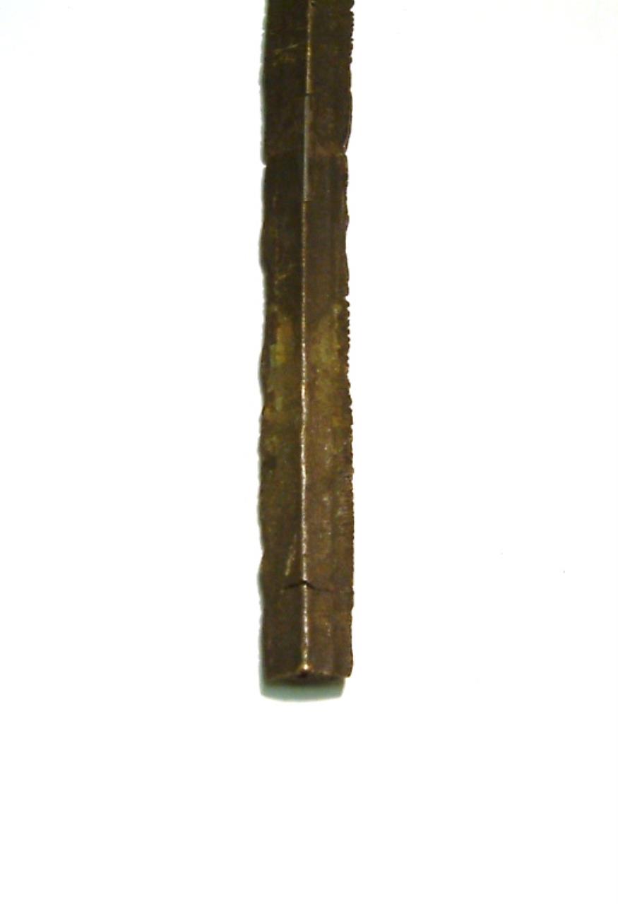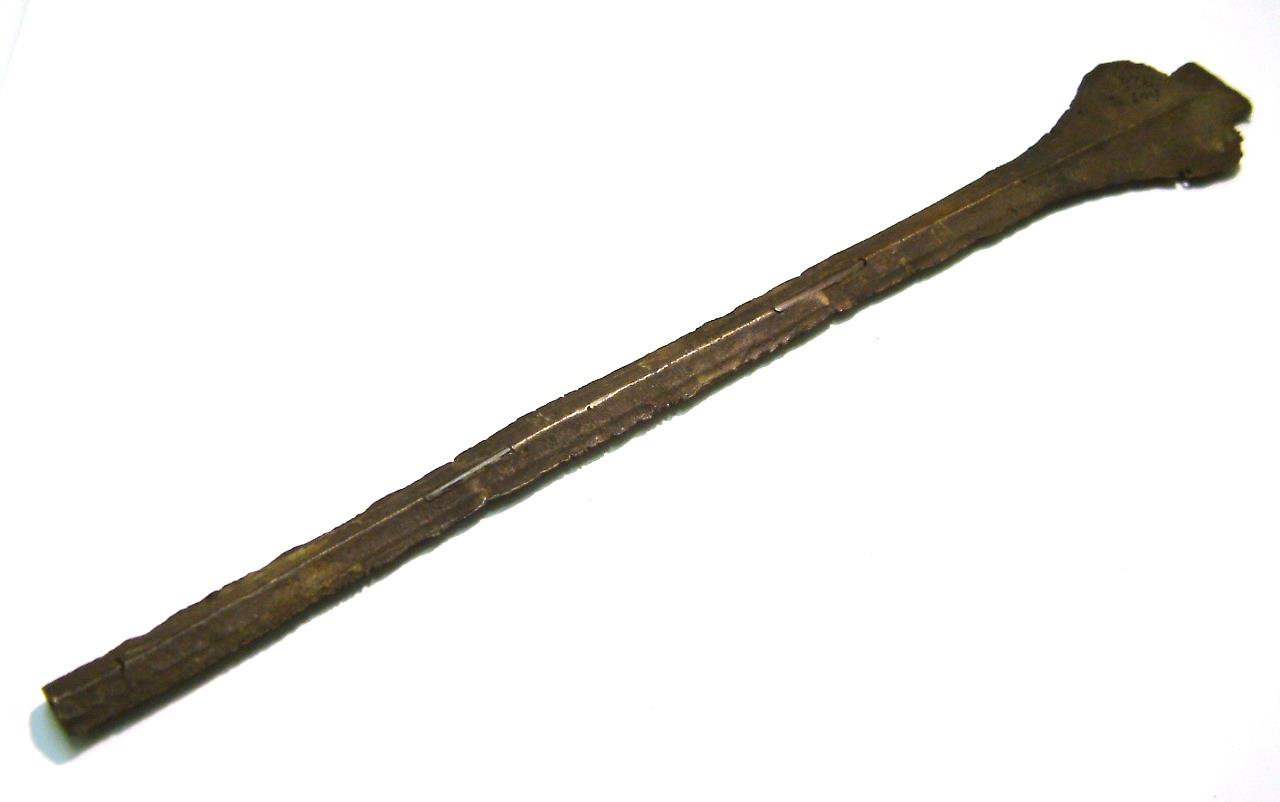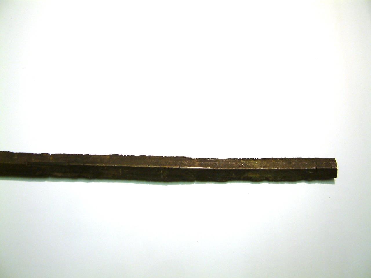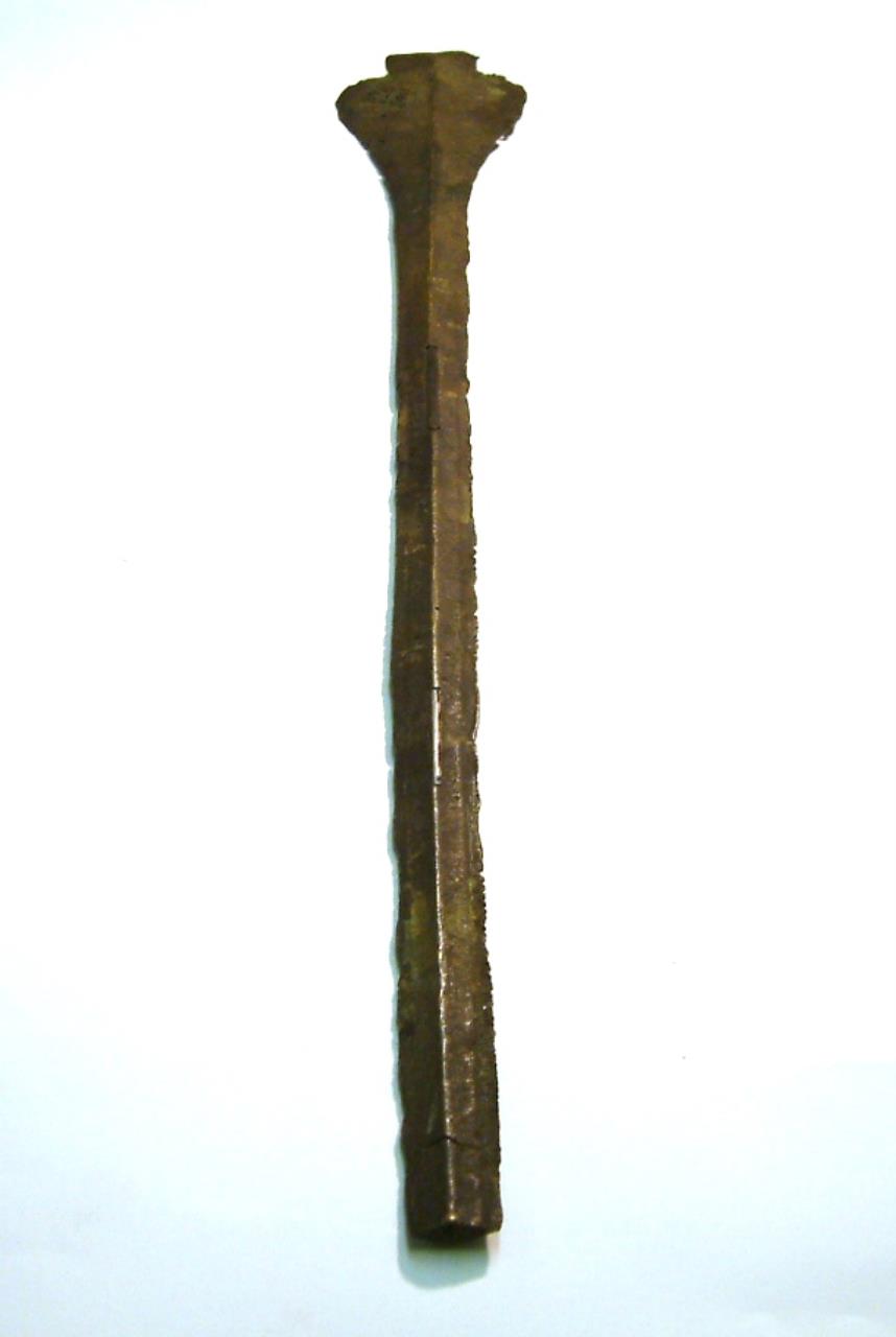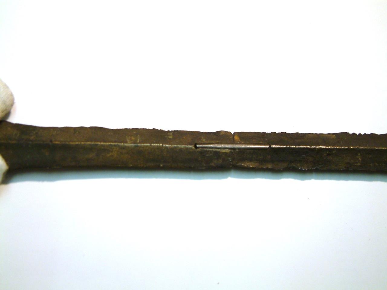 Narrow blade with pronounced keel. Blade has been fractured in two places and repaired. The blade is slightly bent and shows chipping on the lower edges, the tip is missing. The head narrows toward shoulders which are pronounced and rounded, these curve gently to the blade. There is some corrosion evident on the upper segment of the blade but not below the breaks. There is evidence of a further crack about 1cm above the end of the blade.
