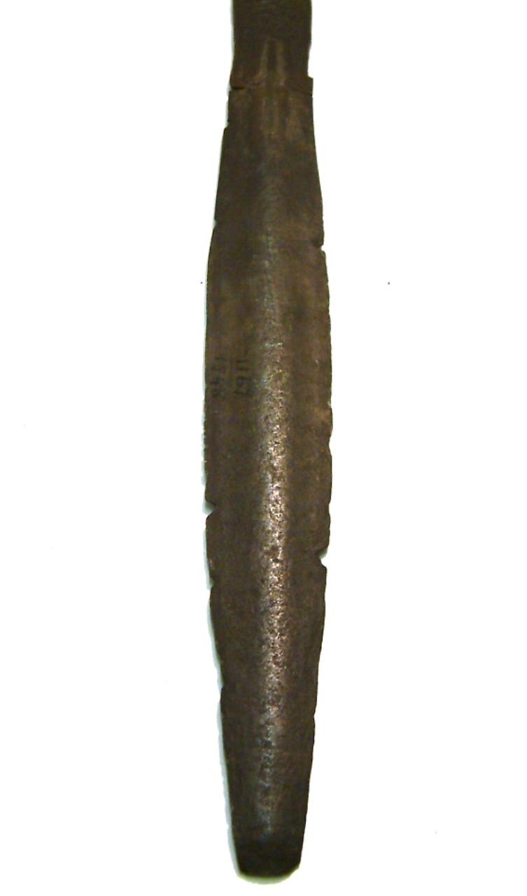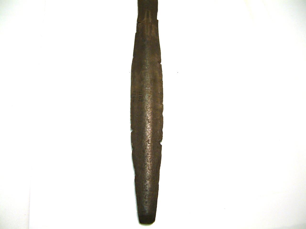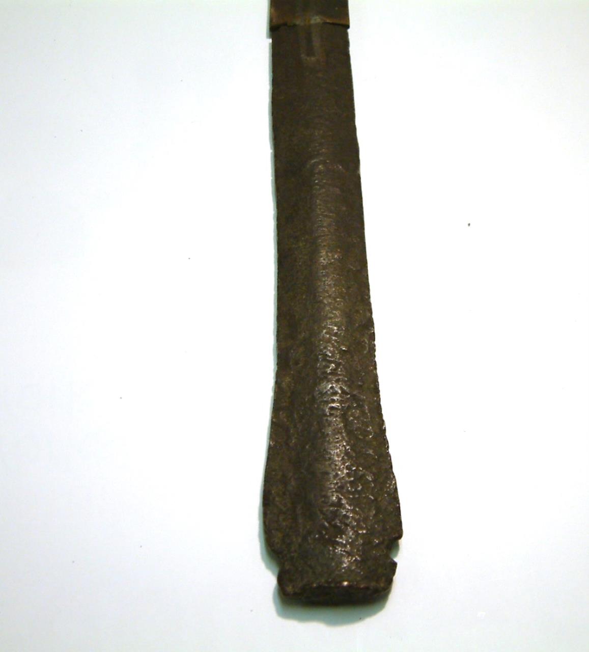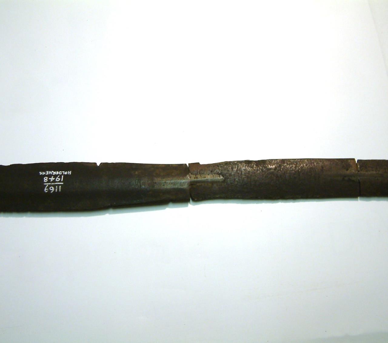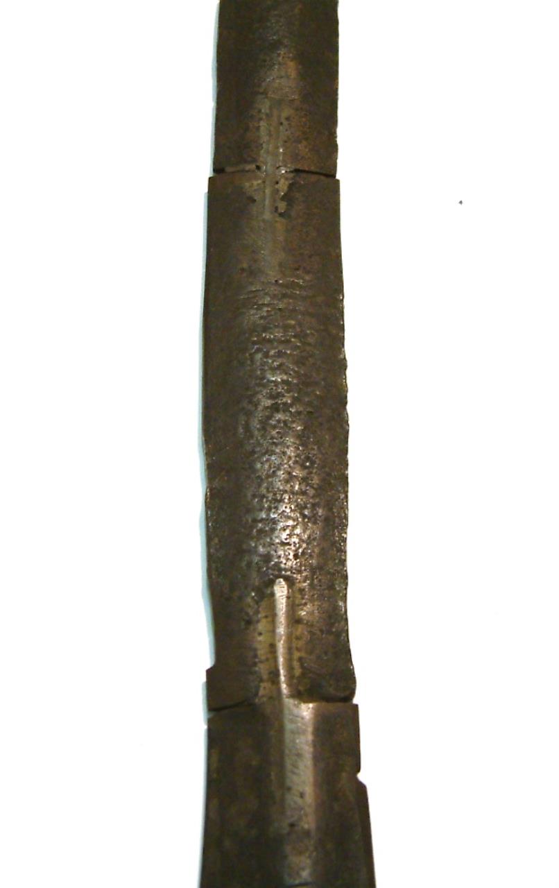 Blade in three pieces which have been rivetted together in modern times. There may in fact be more than one sword blade. The first portion of the blade has a rounded head with two incomplete rivet holes for attaching a handle, the shoulders curve smoothly into the rest of the blade. The second portion of the blade is larger and heavier, it shows clear clean tool marks in various areas of its edge as well as some damage which may be the result of atempts to improve the fit with other parts of the blade, Otherwise however it is in good condition. The third portion is from a leafshaped blade with a smooth central plane. The tip is missing and the end of the blade is bent upward, there are also numerous chips in the cutting edges. All the blades are damaged at the surface where the joins have been filed and some attempts have been made to fill the joints.
