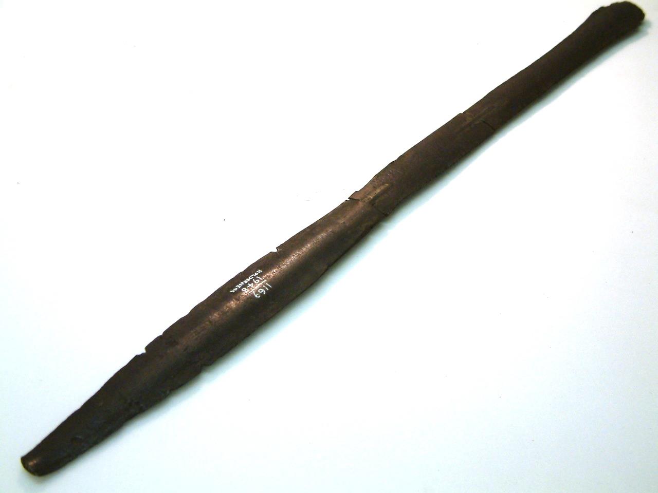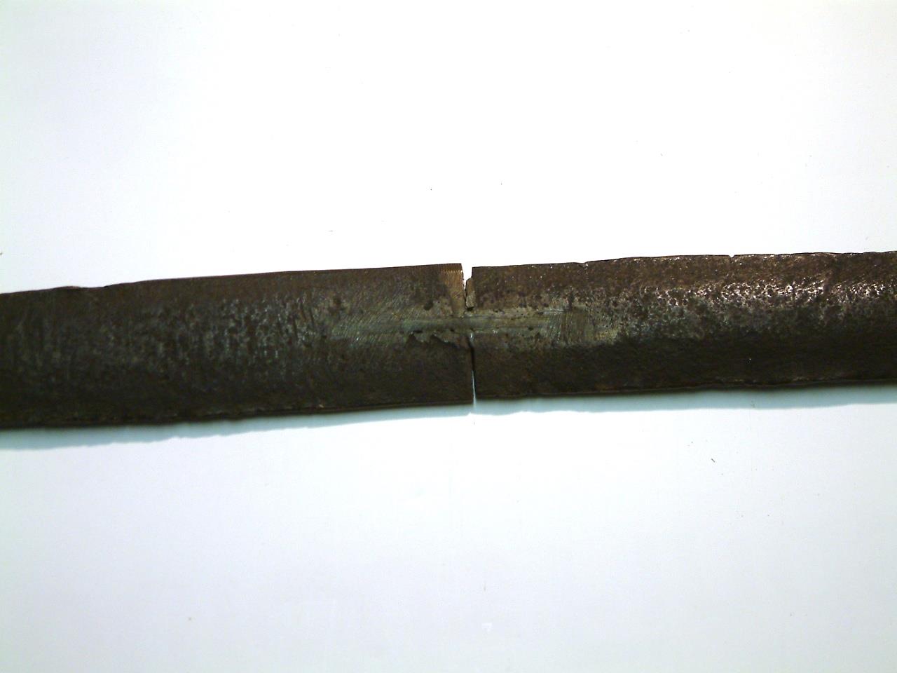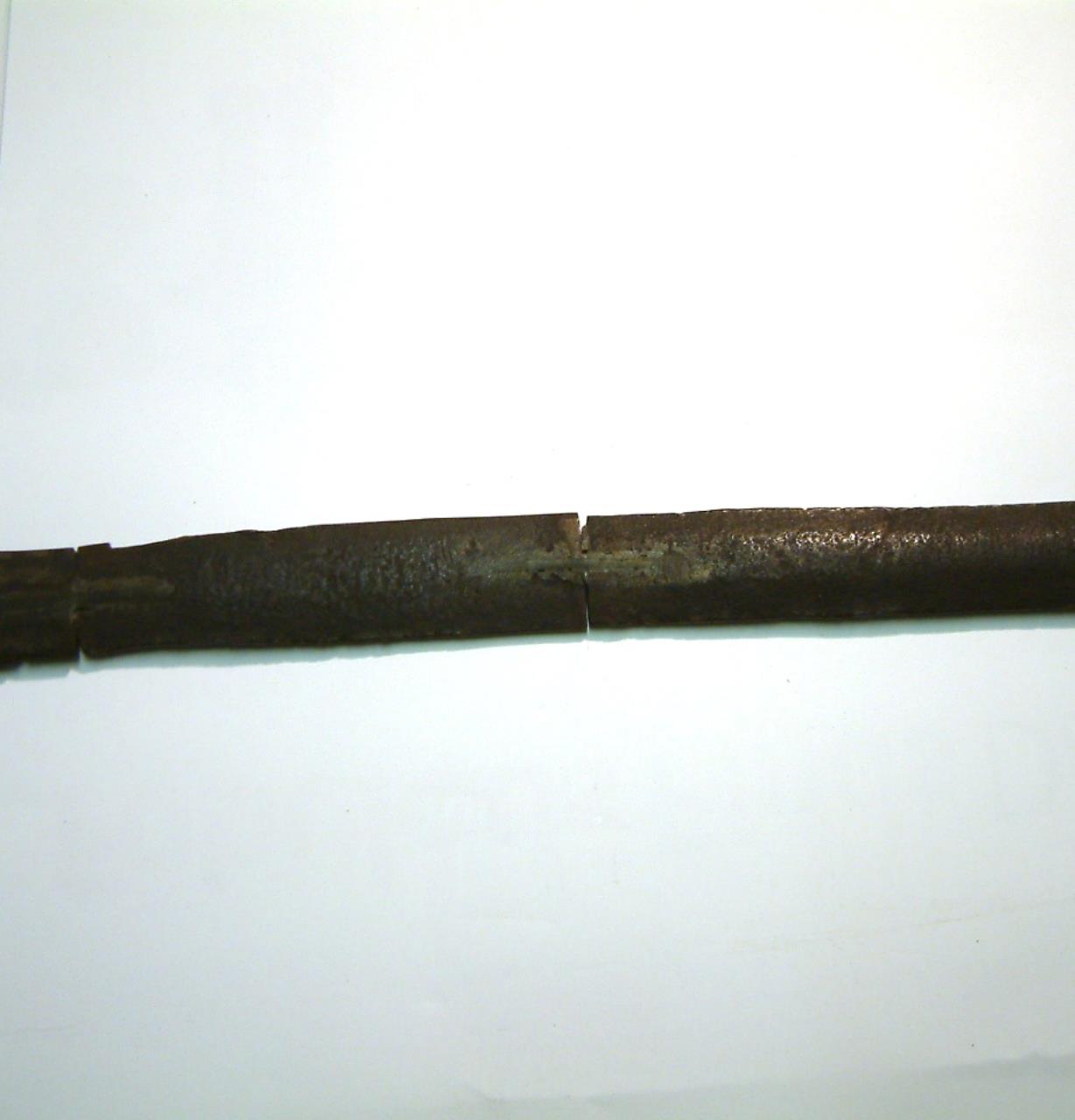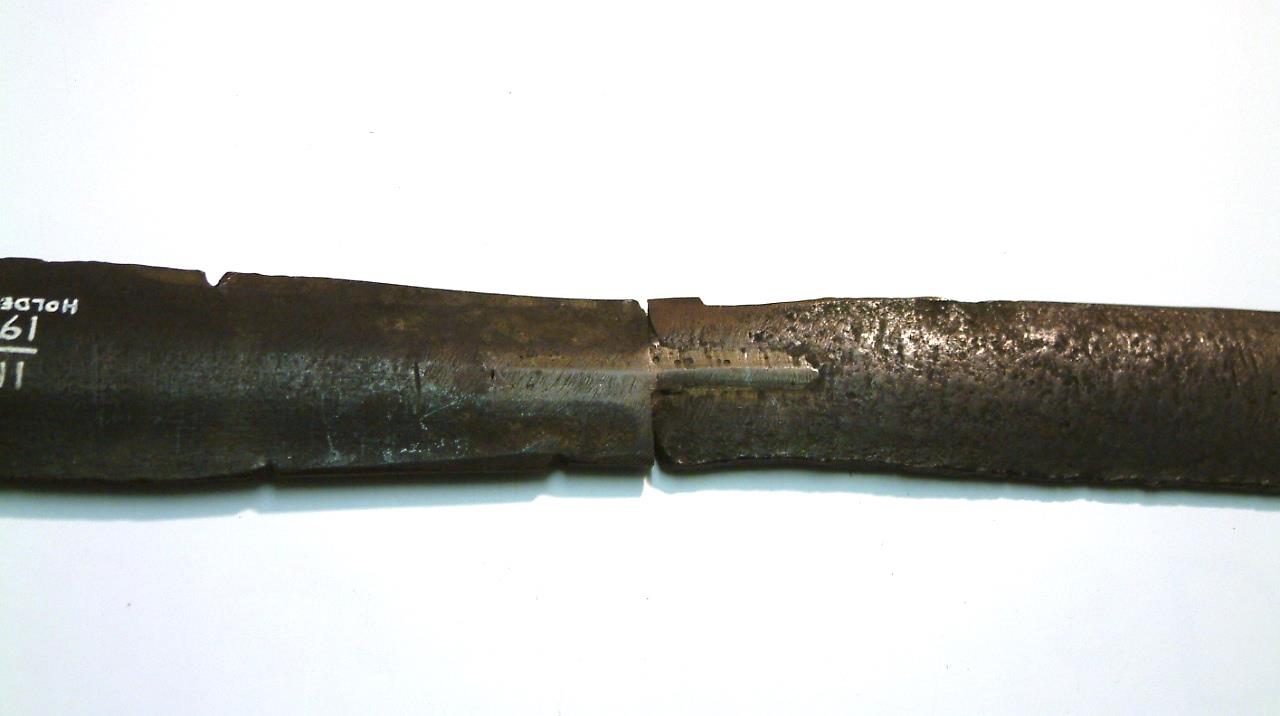 Blade in three pieces which have been rivetted together in modern times. There may in fact be more than one sword blade. The first portion of the blade has a rounded head with two incomplete rivet holes for attaching a handle, the shoulders curve smoothly into the rest of the blade. The second portion of the blade is larger and heavier, it shows clear clean tool marks in various areas of its edge as well as some damage which may be the result of atempts to improve the fit with other parts of the blade, Otherwise however it is in good condition. The third portion is from a leafshaped blade with a smooth central plane. The tip is missing and the end of the blade is bent upward, there are also numerous chips in the cutting edges. All the blades are damaged at the surface where the joins have been filed and some attempts have been made to fill the joints.