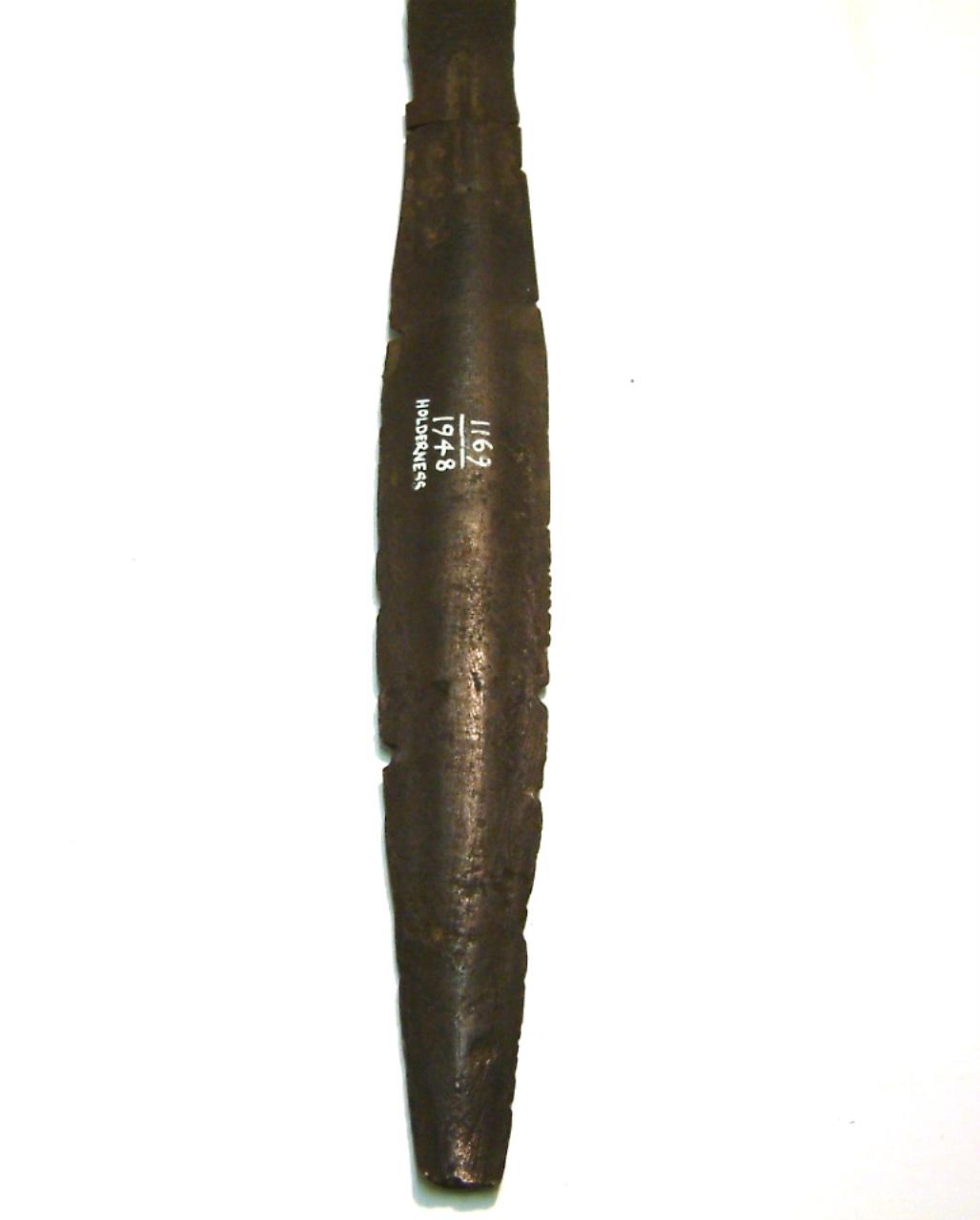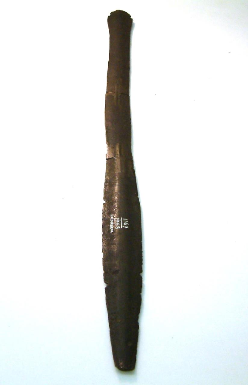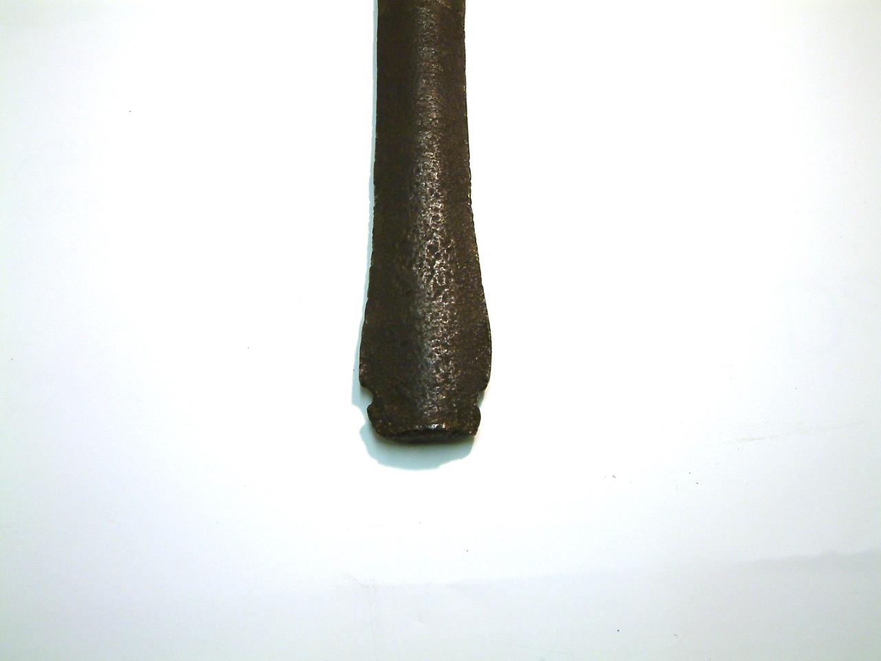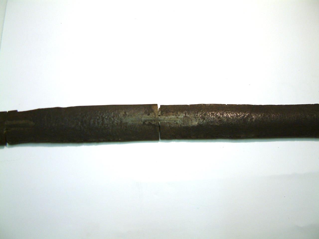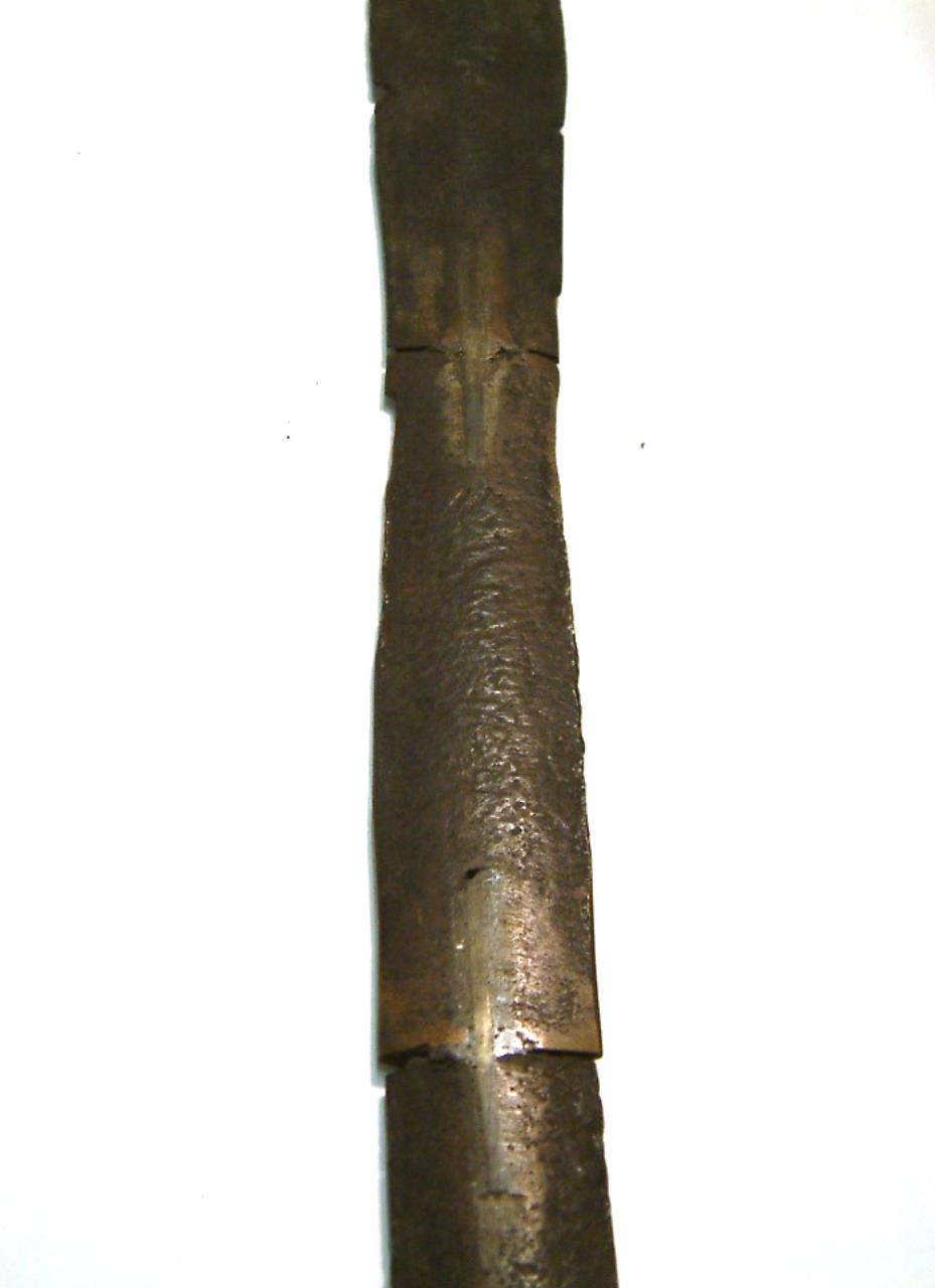 Blade in three pieces which have been rivetted together in modern times. There may in fact be more than one sword blade. The first portion of the blade has a rounded head with two incomplete rivet holes for attaching a handle, the shoulders curve smoothly into the rest of the blade. The second portion of the blade is larger and heavier, it shows clear clean tool marks in various areas of its edge as well as some damage which may be the result of atempts to improve the fit with other parts of the blade, Otherwise however it is in good condition. The third portion is from a leafshaped blade with a smooth central plane. The tip is missing and the end of the blade is bent upward, there are also numerous chips in the cutting edges. All the blades are damaged at the surface where the joins have been filed and some attempts have been made to fill the joints.