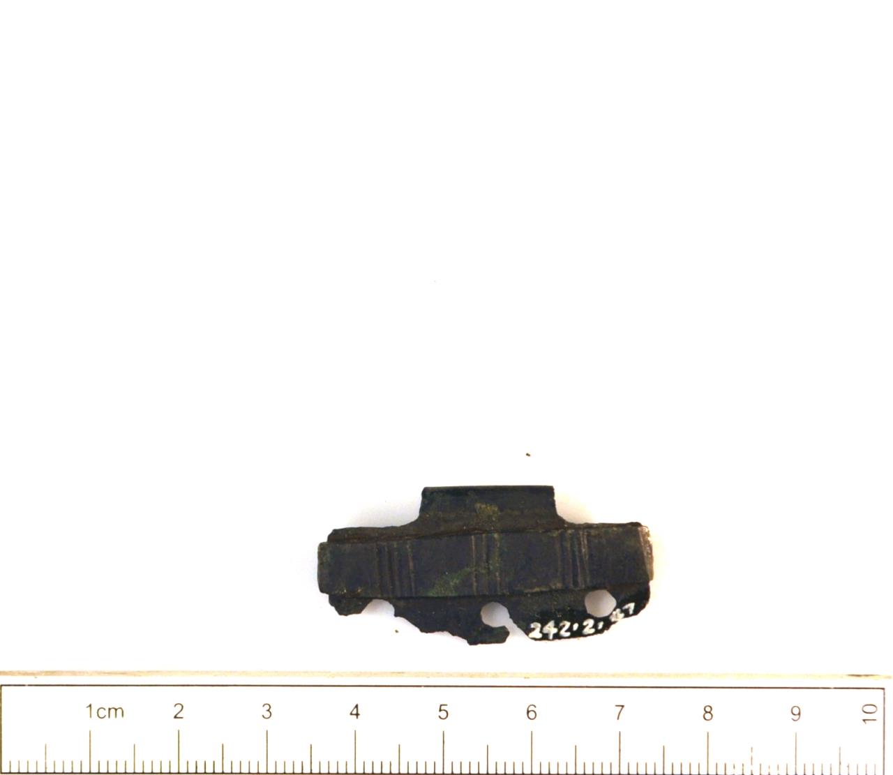 - A rectangular plate with three holes along the bottom edge and a wide loop clasp, attached is a bar with three groups of lines. A section of the bottom edge missing.