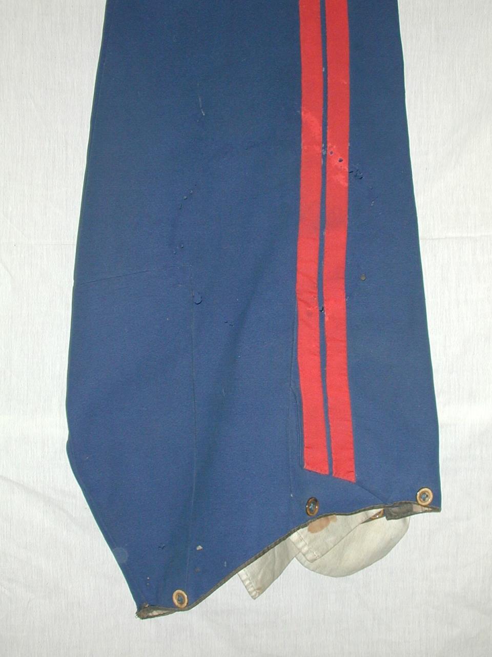 - Trousers of dark blue wool with a double red wool stripe down the side of each leg. Button fly. Buttons around waistband for braces [?] Three side pockets. Waistband and pockets lined with cotton. Buttons inside bottom of legs.