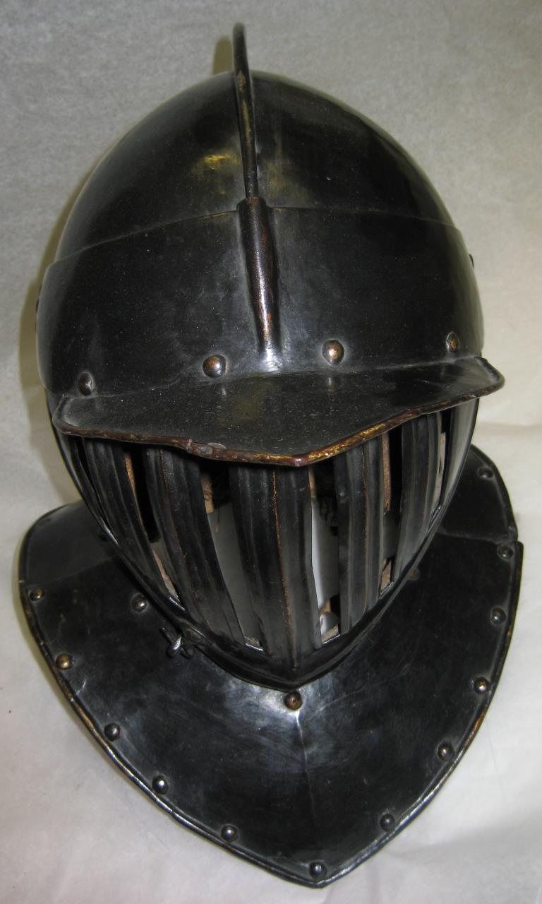 - English close helmet with vertically slatted visor, over which is a peak. Gorget incorporated with the helmet. The piece is opened for use by hook fasteners. There are the remains of leather and hessian inside The entire piece has been painted black. Part of a suit of 3/4 cuirassier armour.