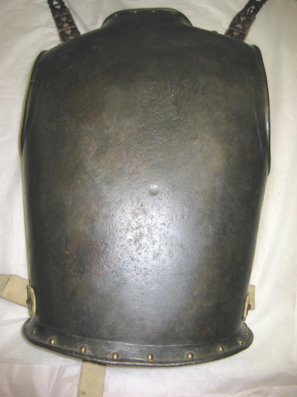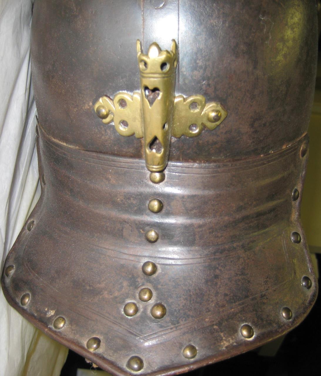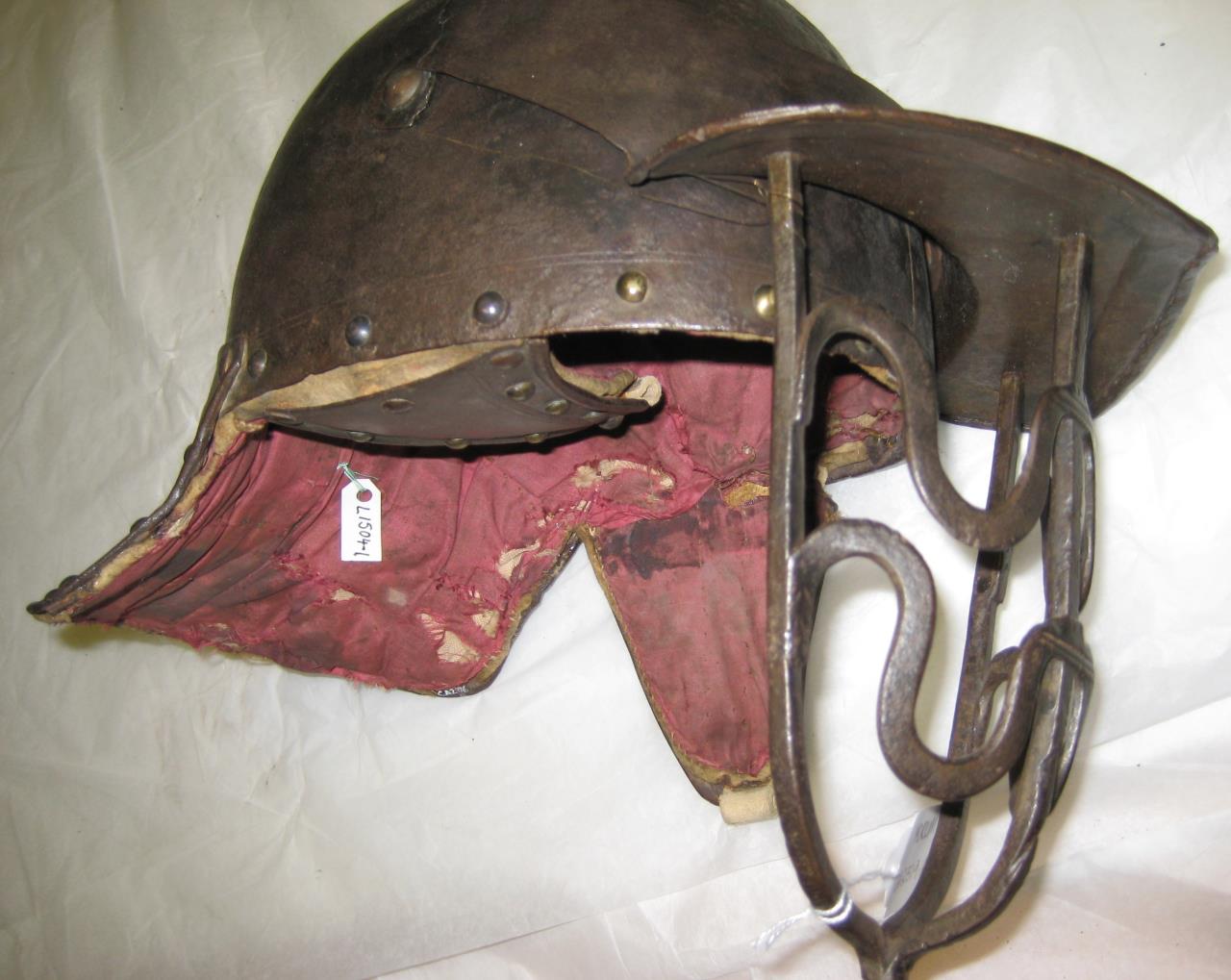 - Back and breast of heavy weight. Breastplate protrudes forwards, and centre ridge ends in a distinct point. Buff straps, brass buckle with iron tongue at waist. Segmented strips at shoulders have pierced heart designs and a thin leather lining strip which once covered the rivets. Right terminal, attachment strip has a rivet parted from the leather strap. Brass rivets at the collar and bottom edge. Quatrefoil backed hook fastenings at chest. Only decoration is two incised lines about 10-12mm in from each side edges and throat/neck. Some rust pitting. Helmet of triple bar style with two wavy reinforcing bars. Triangular cheek pieces held on by buff leather strip rivetted inside rim. Liner of silk over linen over unknown fibre sewn to later edging strip. False lames on neck. Left side visor arm broken by the rivet, which is jammed. The rear of the helmet has a gold-coloured detail which appears to be a holder for a centre ridge piece. Possibly New Model Army Pattern.