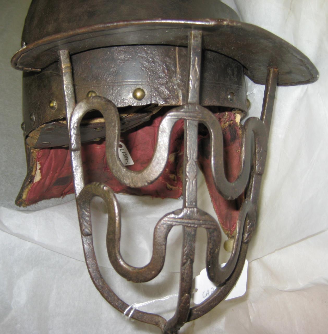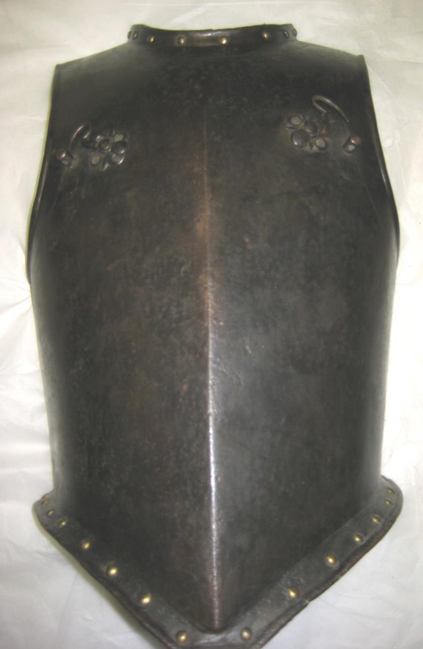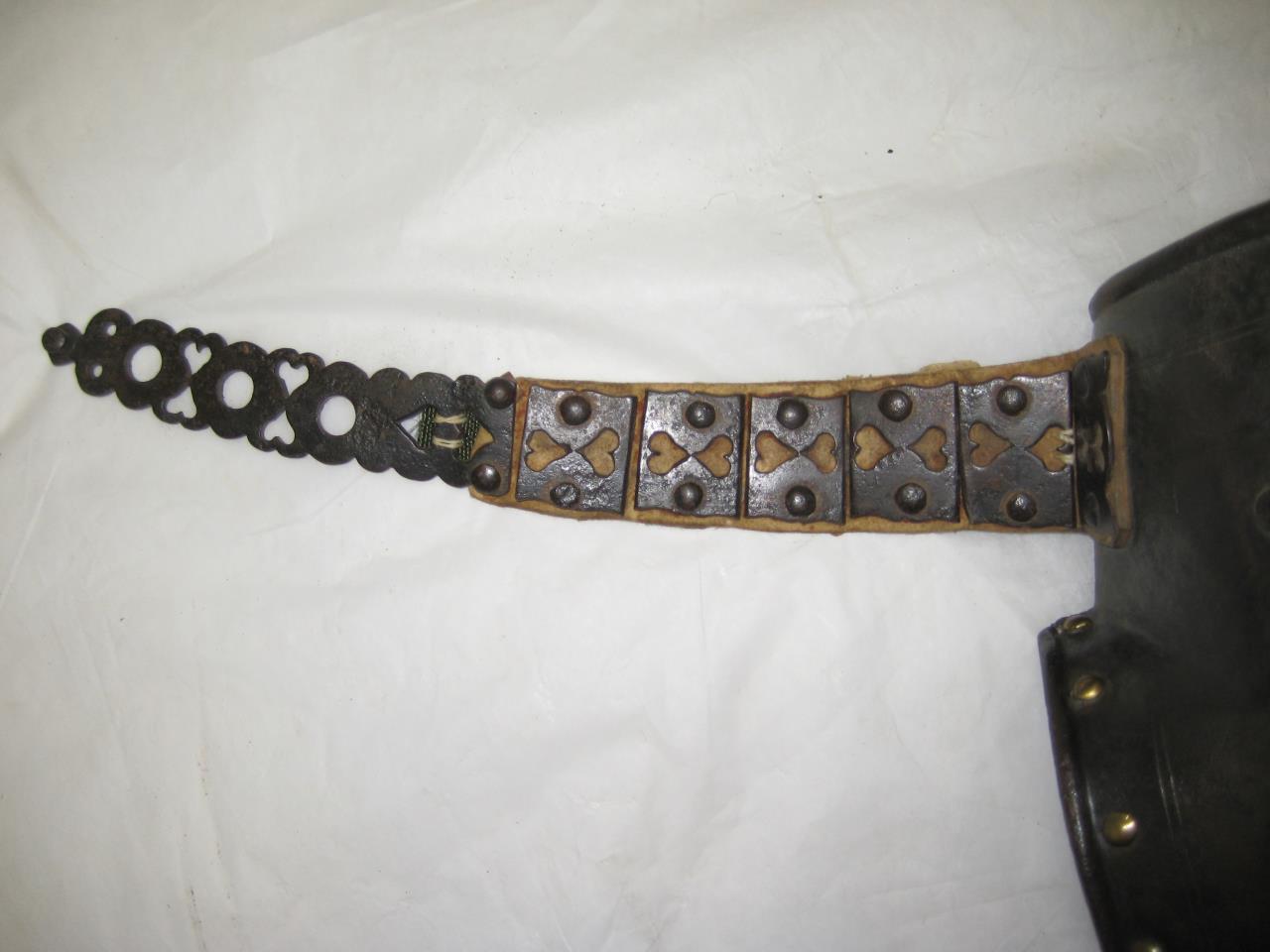 - Back and breast of heavy weight. Breastplate protrudes forwards, and centre ridge ends in a distinct point. Buff straps, brass buckle with iron tongue at waist. Segmented strips at shoulders have pierced heart designs and a thin leather lining strip which once covered the rivets. Right terminal, attachment strip has a rivet parted from the leather strap. Brass rivets at the collar and bottom edge. Quatrefoil backed hook fastenings at chest. Only decoration is two incised lines about 10-12mm in from each side edges and throat/neck. Some rust pitting. Helmet of triple bar style with two wavy reinforcing bars. Triangular cheek pieces held on by buff leather strip rivetted inside rim. Liner of silk over linen over unknown fibre sewn to later edging strip. False lames on neck. Left side visor arm broken by the rivet, which is jammed. The rear of the helmet has a gold-coloured detail which appears to be a holder for a centre ridge piece. Possibly New Model Army Pattern.