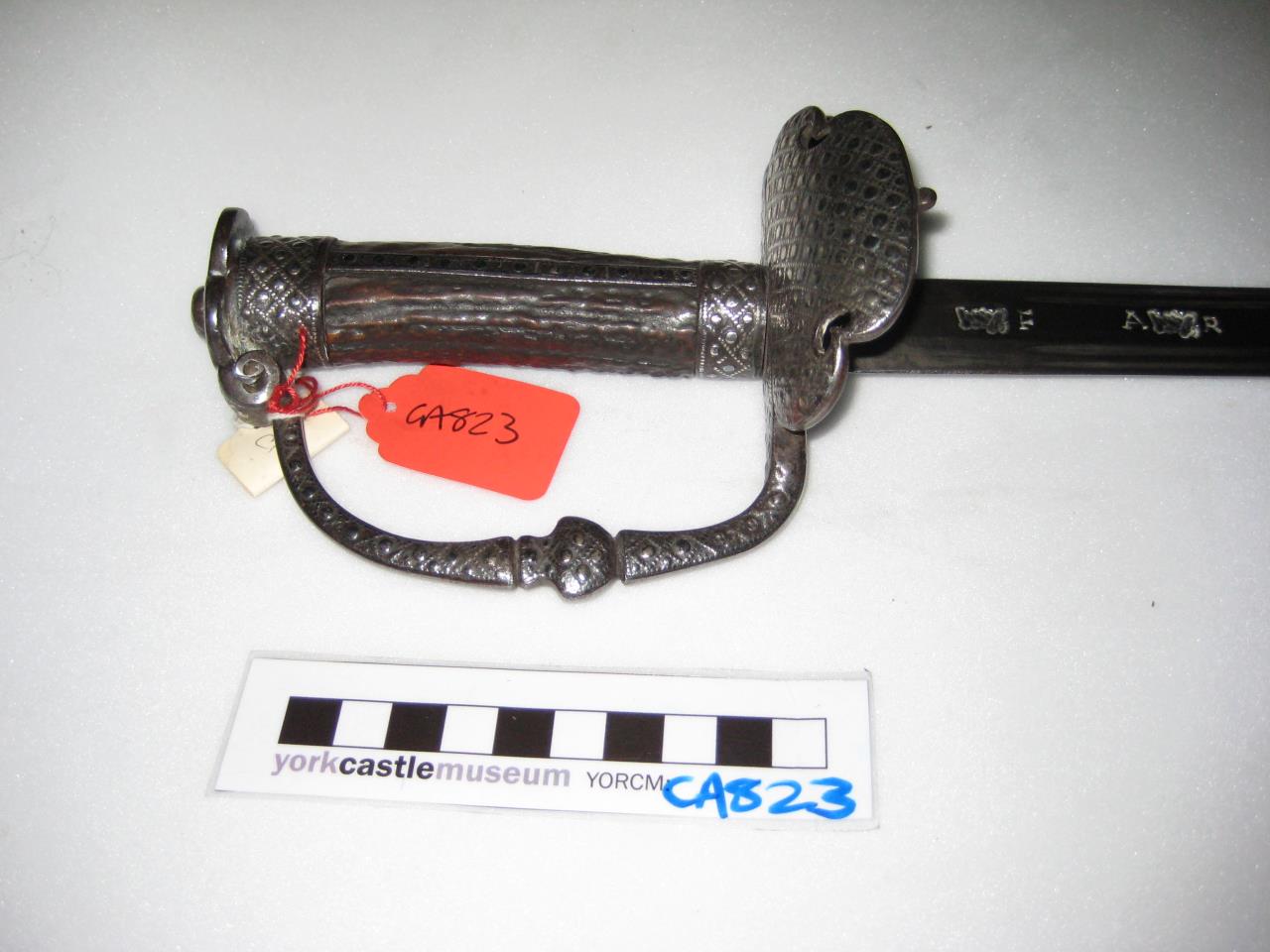 Short sword with straight single edged blade, stags horn grip and silver mounted hilt. Hilt has single knucklebow with central knop and downturned quillon with knop, quatrefoil pommel cap , decorated with silver beaded lines to make a regular squared pattern each having a central bead. Sub diamond section blade with two short false fullers either side of maker's name - * represents a heavily stmped left facing head in profile, one side " * A N*D R*E A* " other side " *F A*R A*R A*"