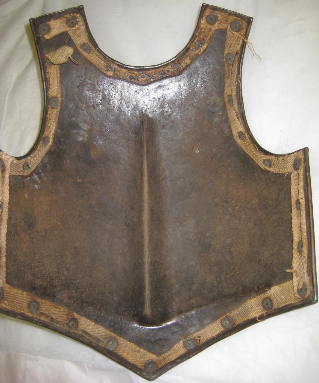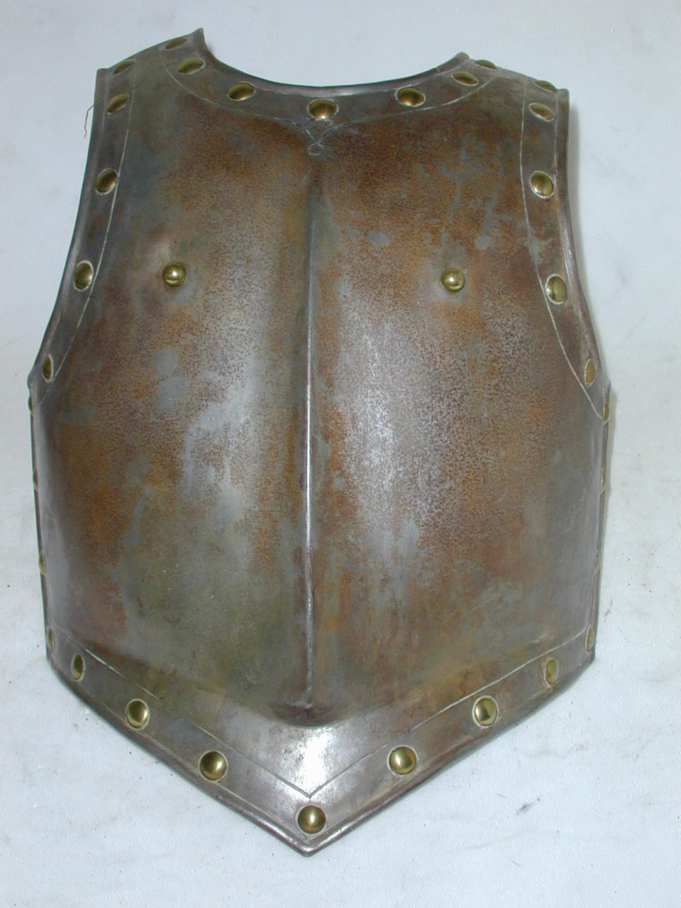 - Steel breastplate with folded edges along the sides and the neck. 32 brass studs around the edge inside an engraved line which follows the shape of the armour, there are remains of hessian type cloth tapes for attachment of a lining. There is a pronounced ridge running down the centre of the chest line with two spherical brass lugs for the attachment of shoulder straps either side of the ridge.