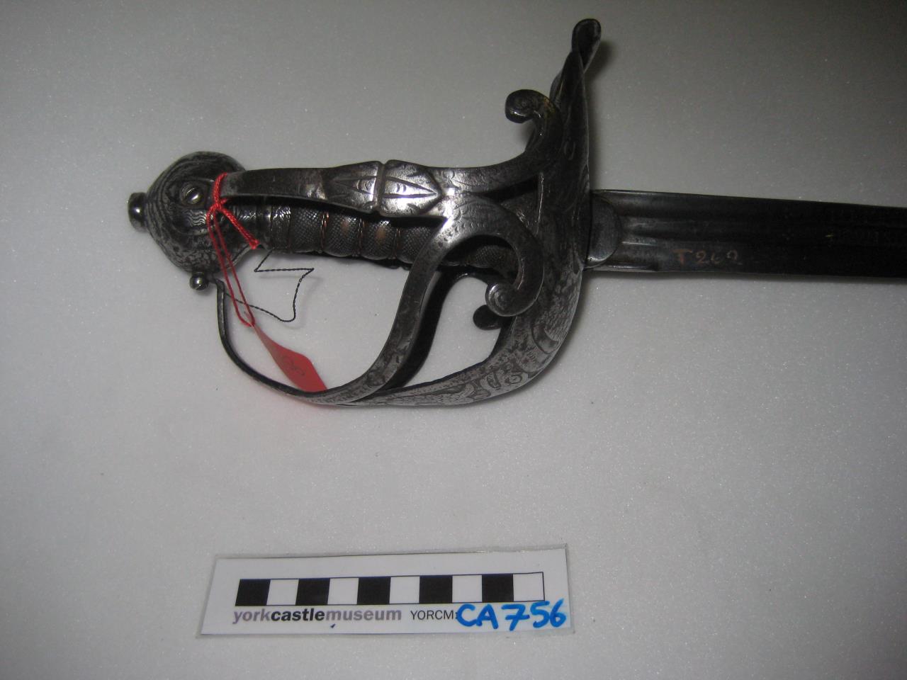 - Single edged blade with four long, deep, fullers each side, inscribed "ME FECIT HVNSLOE" on both sides. Basket hilt with pierced and chased designs including human masks and a sea monster. Pommel is chiselled with grotesques or monster's heads.