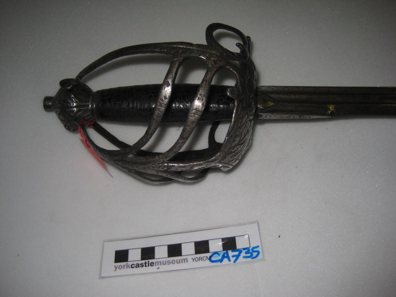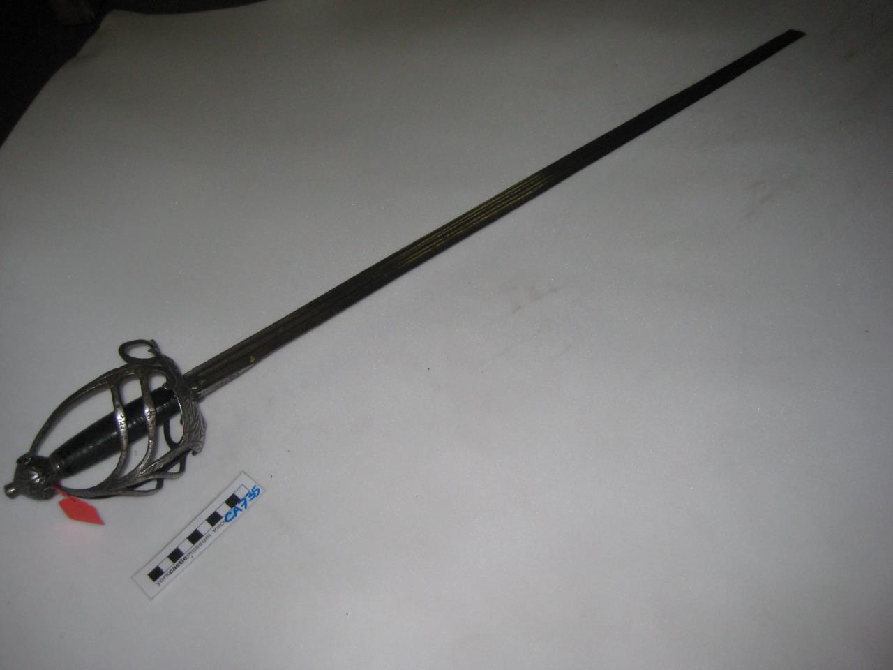 - Single edged double grooved blade marked " ANDRIA FERARA". Basket hilt cast, pierced and chased with a decoration of foliage and strawberries. The grip is leather over a wire wrap. Tip of blade broken off and missing