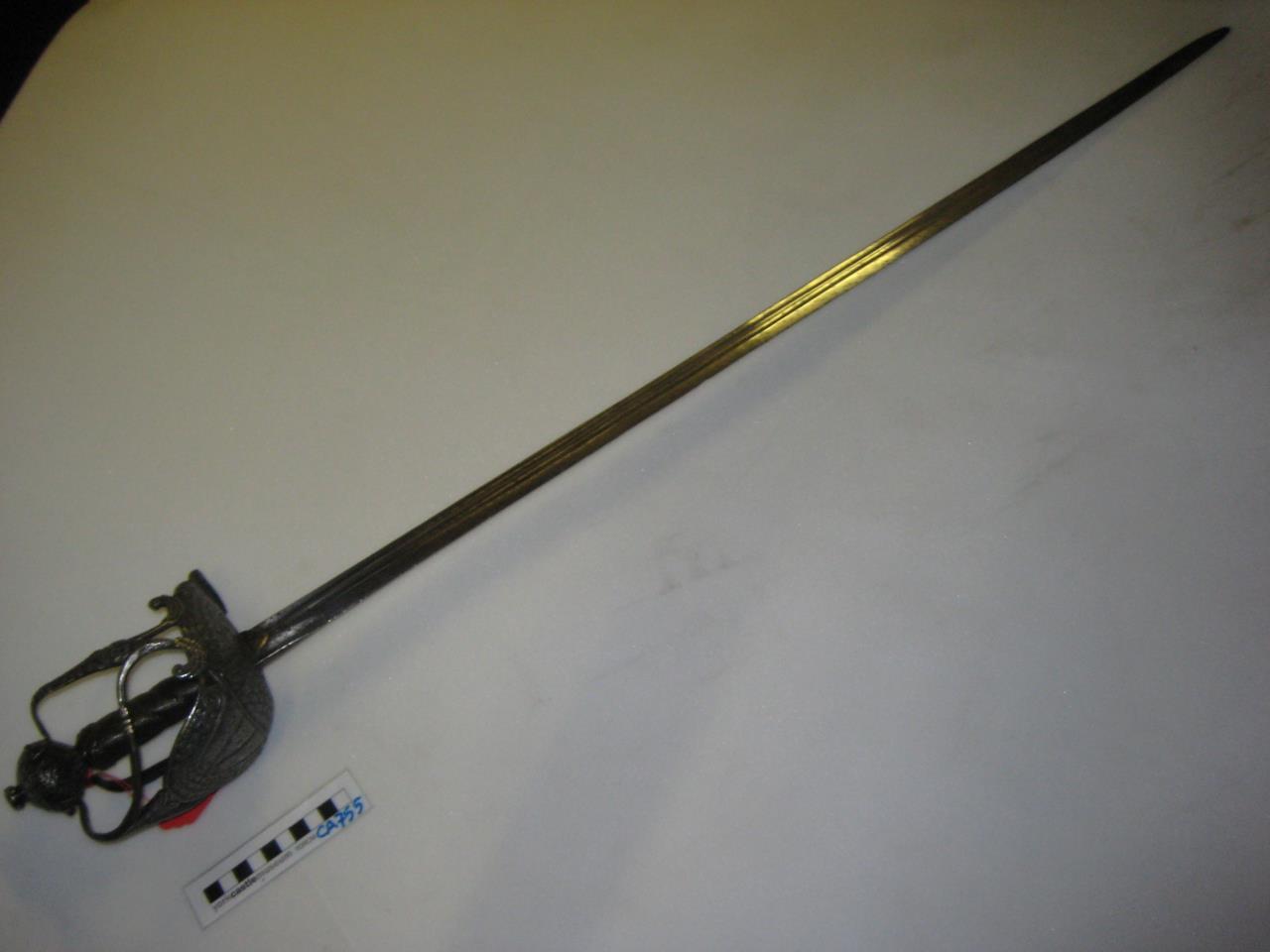 - Single edged blade with two grooves per side, marked "IHN SOLINGEN". Basket hilt cast, pierced and chased with a feather designs. Likely to be an English hilted German blade.