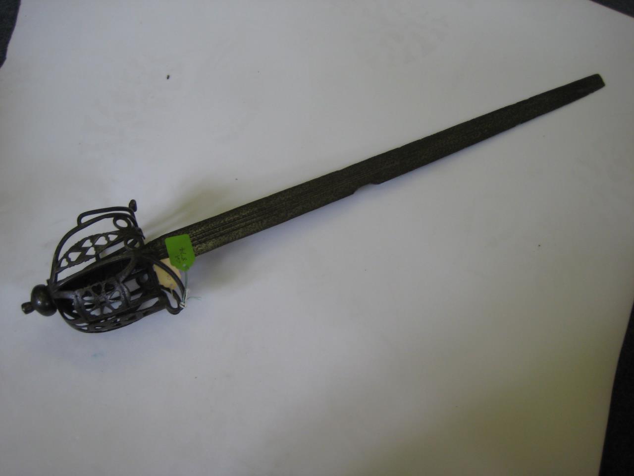 - Double edged blade marked with an orb and double cross and "CLEMENS HONN ME FECIT SOLINGEN". English basket hilt cast, pierced and chased with a decoration showing masks and leaves. German blade with an English hilt.