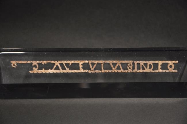 Openwork mount with letters spelling out S(OR)ORAVEVIVASINDEO (Soror ave vivas in deo). Eboracum describes this grave group and the circumstances of the find: "Coffin and grave goods, found in 1901 at the N end of Sycamore Terrace, about 2ft from the S boundary wall of Love Lane (NG 5968 5236). The stone coffin, with a ridged lid, already broken into three pieces when found, contained the skeleton of a woman 5ft 4ins. tall lying on her back. The grave goods H5 -12, consisted of a dark blue glass flagon with applied threads on the neck, an open work inscription in bone, SOROR AVE VIVAS IN DEO "Hail sister, may you live in God" two jet bangles, a bracelet of blue glass beads, fragments of five bone bracelets, silver and bronze lockets, two yellow glass ear-drops, two marbled glass beads, and a small round glass mirror. This burial is often described as Christian." The inscription itself is described as "Slip of bone, with an openwork inscription, probably from a casket.... The language is Christian and was no doubt intended to attract a Christian purchaser: but the burial is otheriwse pagan in its equipment of glass drinking vessels and jewellery."