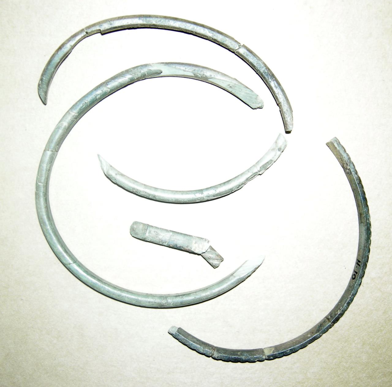 Plain. Eboracum describes this grave group and the circumstances of the find: "Coffin and grave goods, found in 1901 at the N end of Sycamore Terrace, about 2ft from the S boundary wall of Love Lane (NG 5968 5236). The stone coffin, with a ridged lid, already broken into three pieces when found, contained the skeleton of a woman 5ft 4ins. tall lying on her back. The grave goods H5 -12, consisted of a dark blue glass flagon with applied threads on the neck, an open work inscription in bone, SOROR AVE VIVAS IN DEO "Hail sister, may you live in God" two jet bangles, a bracelet of blue glass beads, fragments of five bone bracelets, silver and bronze lockets, two yellow glass ear-drops, two marbled glass beads, and a small round glass mirror. This burial is often described as Christian."