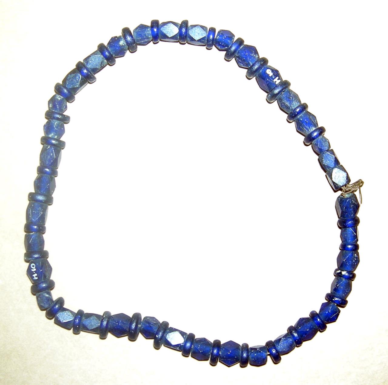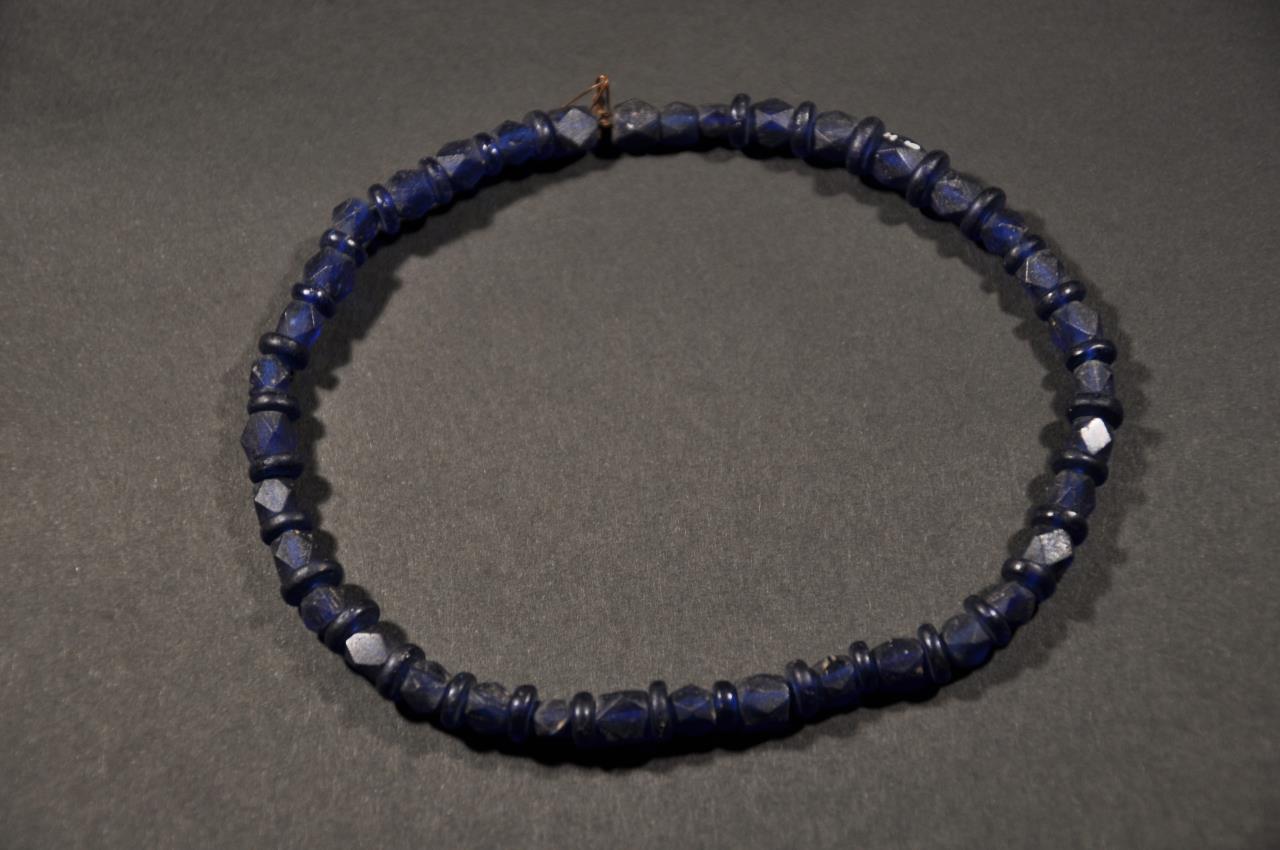 - Thirty-seven diamond- and triangle-faceted cubic beads and thirty-four short cylindrical beads; deep-blue glass. Eboracum describes this grave group and the circumstances of the find: "Coffin and grave goods, found in 1901 at the N end of Sycamore Terrace, about 2ft from the S boundary wall of Love Lane (NG 5968 5236). The stone coffin, with a ridged lid, already broken into three pieces when found, contained the skeleton of a woman 5ft 4ins. tall lying on her back. The grave goods H5 -12, consisted of a dark blue glass flagon with applied threads on the neck, an open work inscription in bone, SOROR AVE VIVAS IN DEO "Hail sister, may you live in God" two jet bangles, a bracelet of blue glass beads, fragments of five bone bracelets, silver and bronze lockets, two yellow glass ear-drops, two marbled glass beads, and a small round glass mirror. This burial is often described as Christian."
